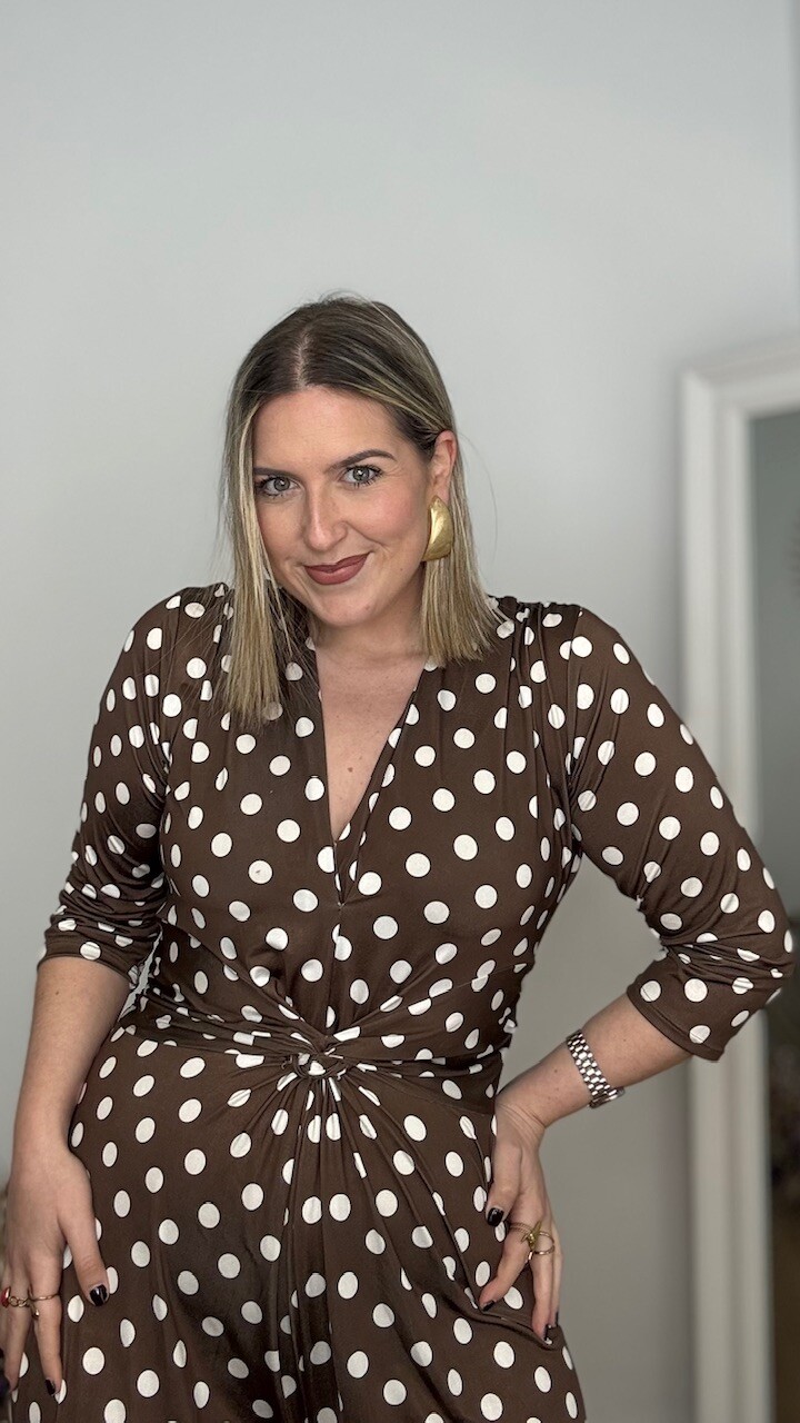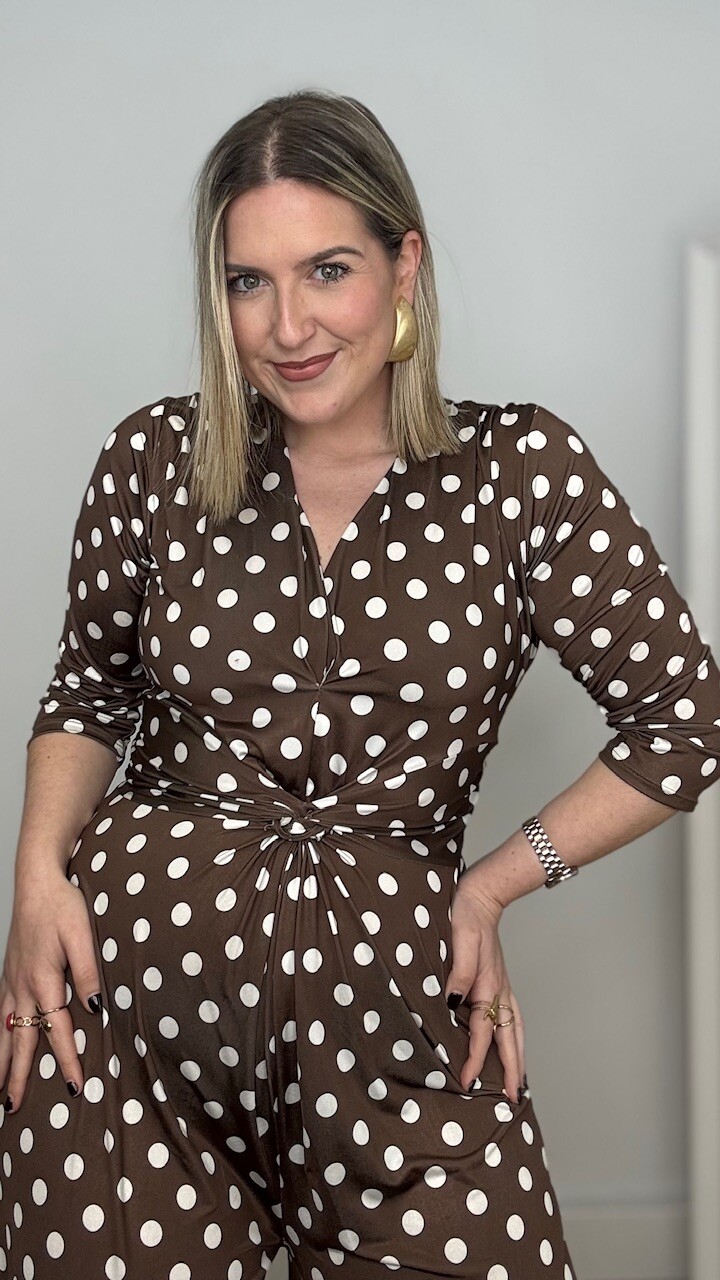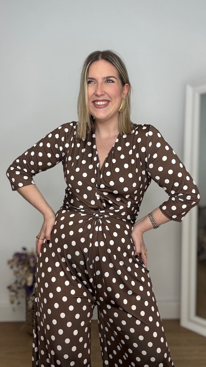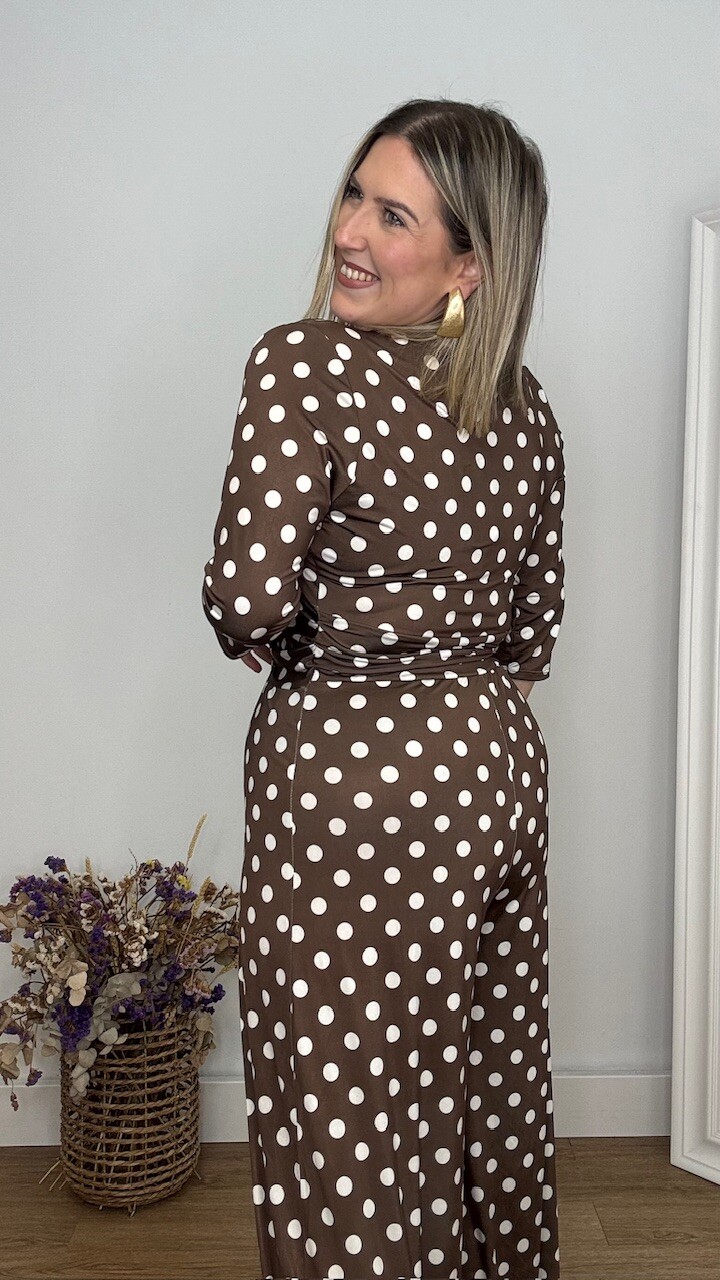 Mono con mangas de licra elástica en color marrón con lunares en color blanco. Talla única desde la talla 38/40 hasta la talla 44/46.