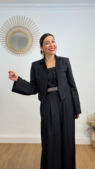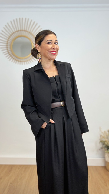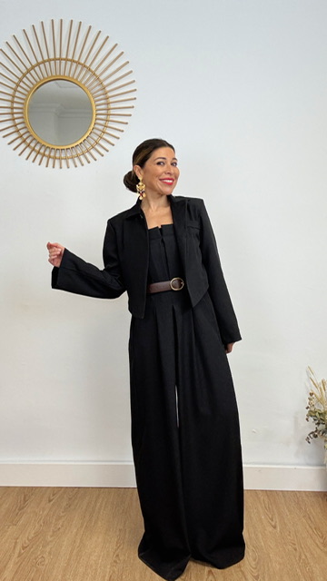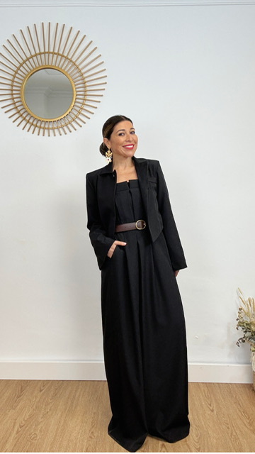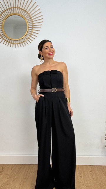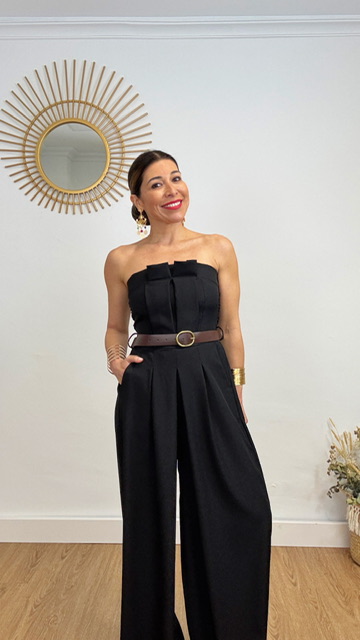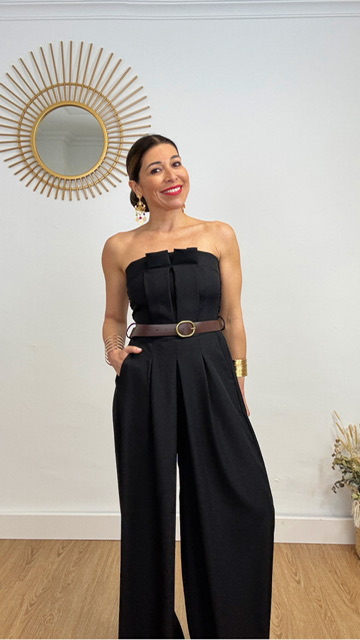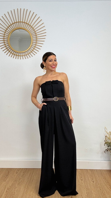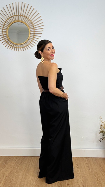 Mono de pata ancha de palabra de honor en color negro. Incluye chaquetilla en color negro. Talla única válida desde la 36 hasta la talla 40/42.