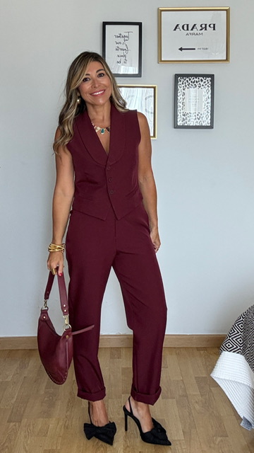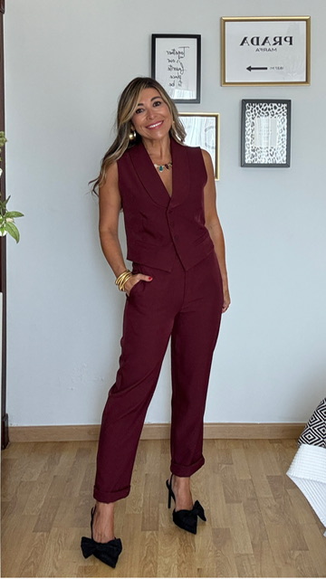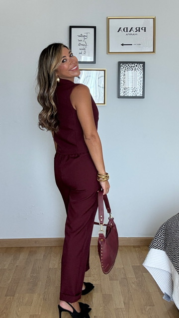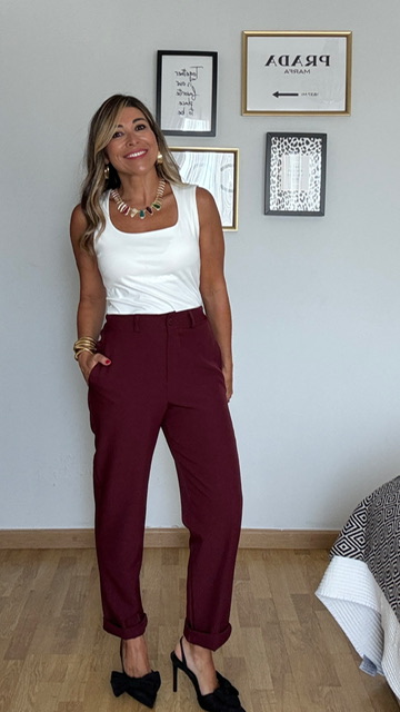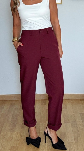 Pantalón de vestir con cinturilla elástica por la parte trasera en color burdeos. Cierre con botón y cremallera. Disponible por tallas.
