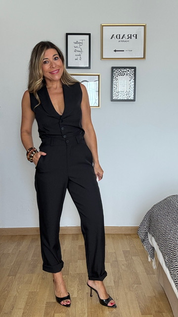 Pantalón de vestir con cinturilla elástica por la parte trasera en color negro. Cierre con botón y cremallera. Disponible por tallas.