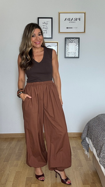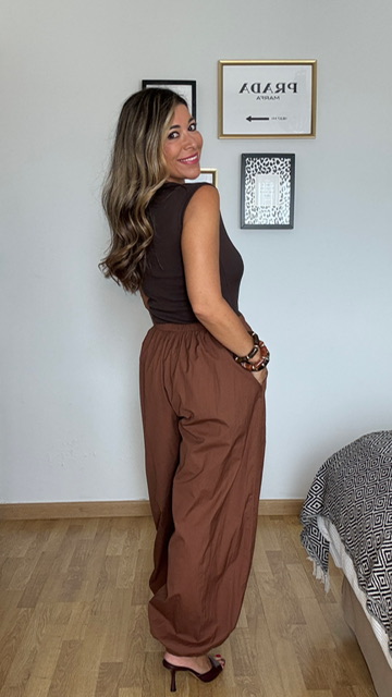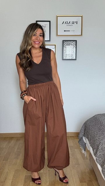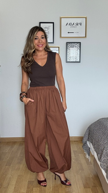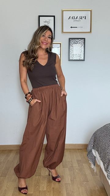 Pantalón bombacho en color marrón con cinturilla elástica. Talla única válida desde la 36 hasta la 44.