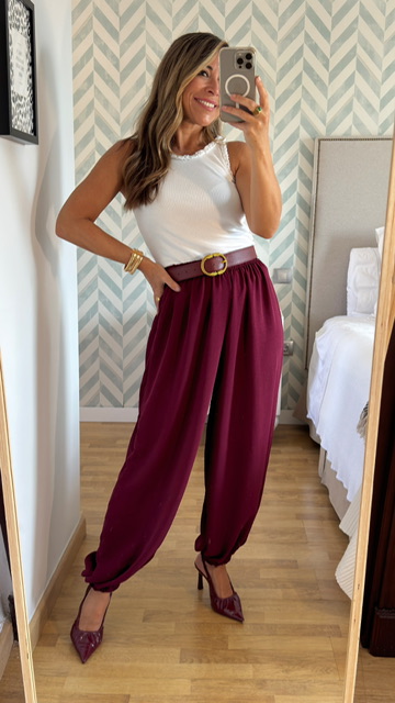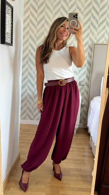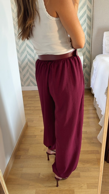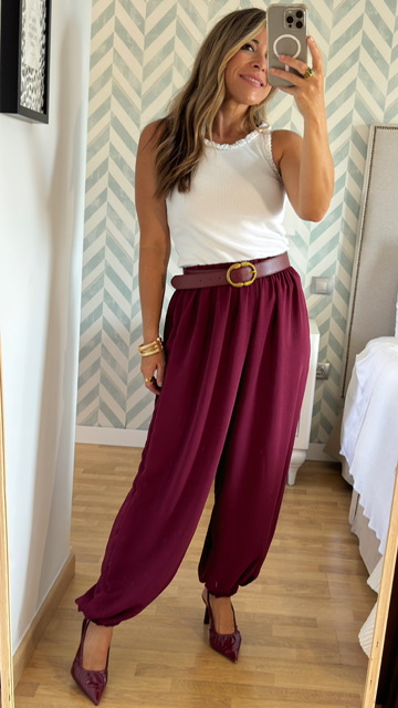 Pantalón bombacho confeccionado en tejido de gasa en color burdeos. Lleva cinturilla elástica y terminación elástica. Talla única válida desde la 36 hasta la 44. Cinturón de piel no incluido.