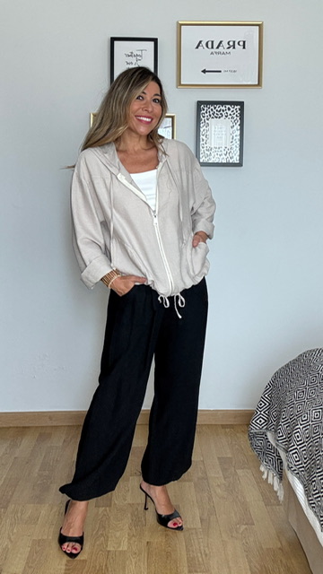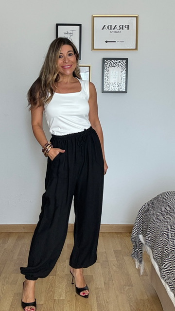 Pantalón bombacho confeccionado de tejido de viscosa con cinturilla elástica . Talla única válida desde la 36 hasta la 40.