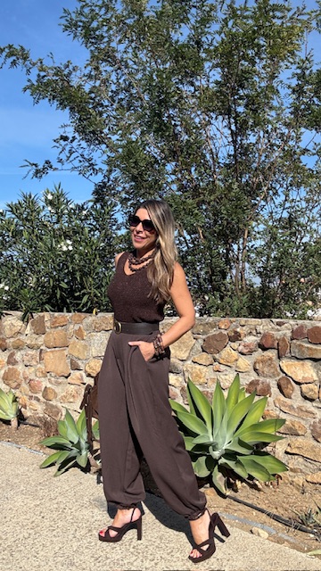 Pantalón bombacho en color marrón chocolate con pinzas delanteras y bolsillos. Lleva cinturilla elástica en la parte trasera. Talla única válida desde la 36 hasta la 42.