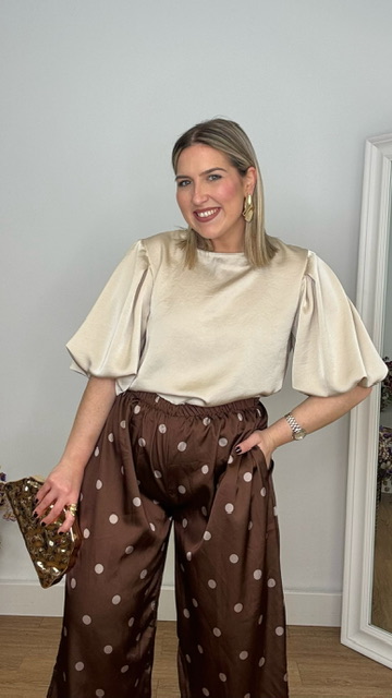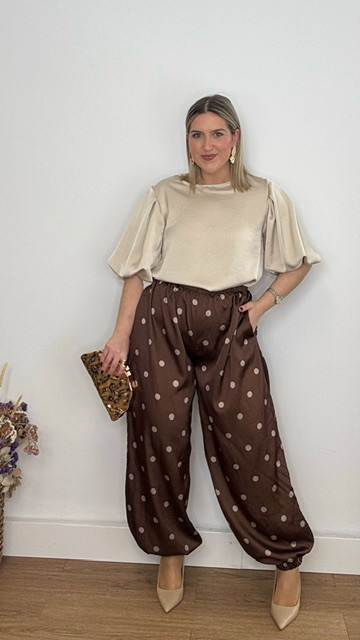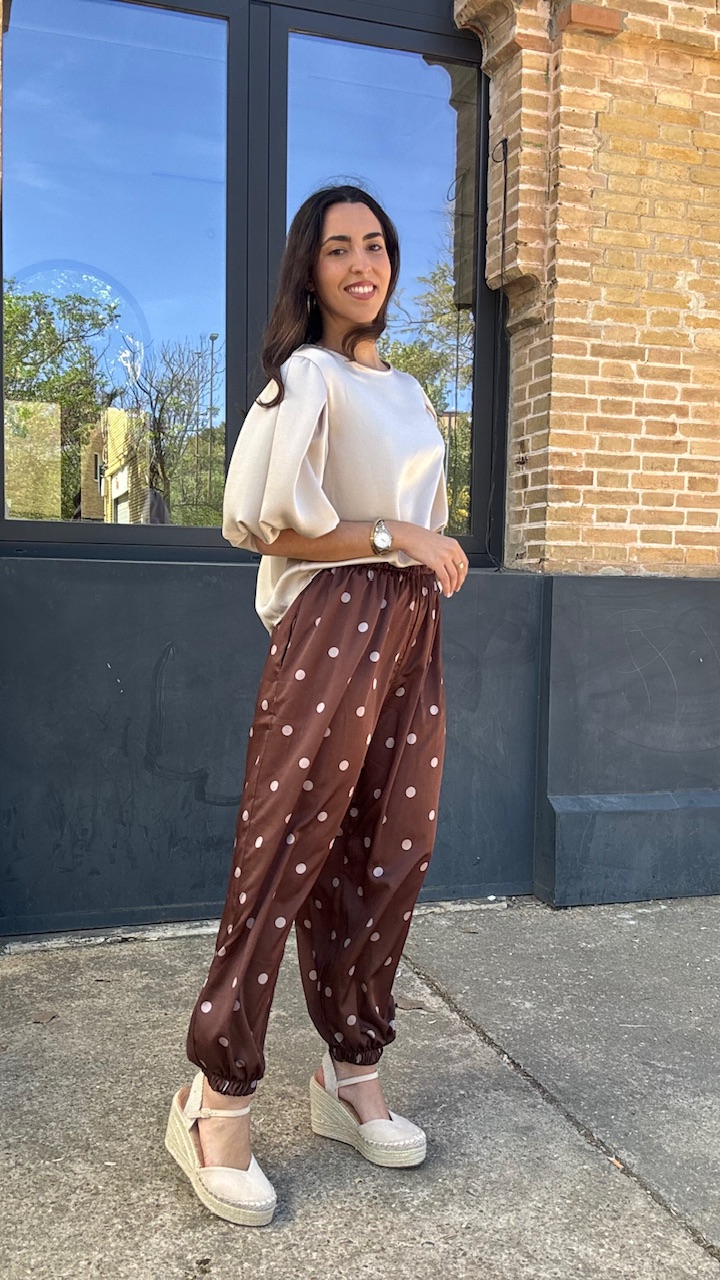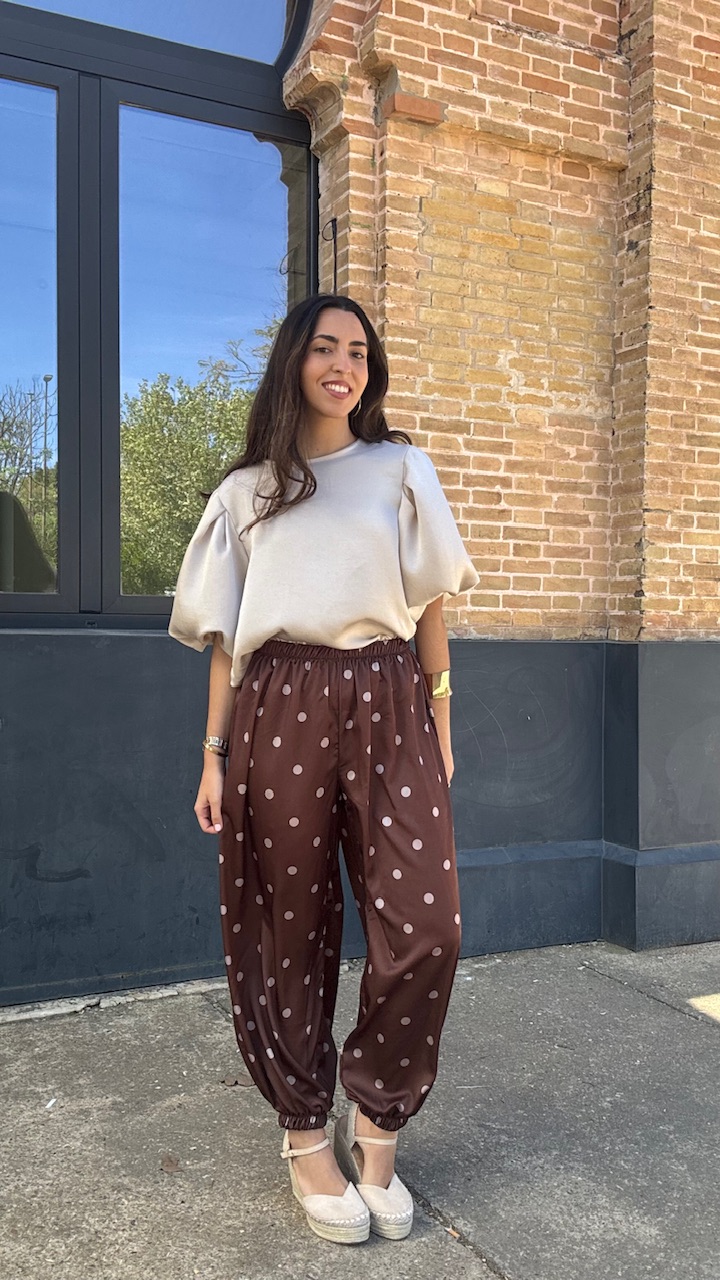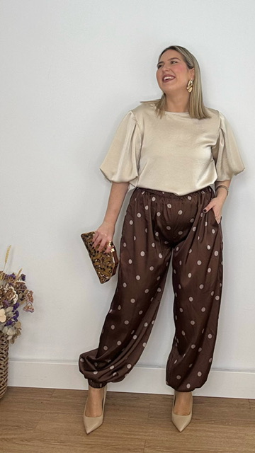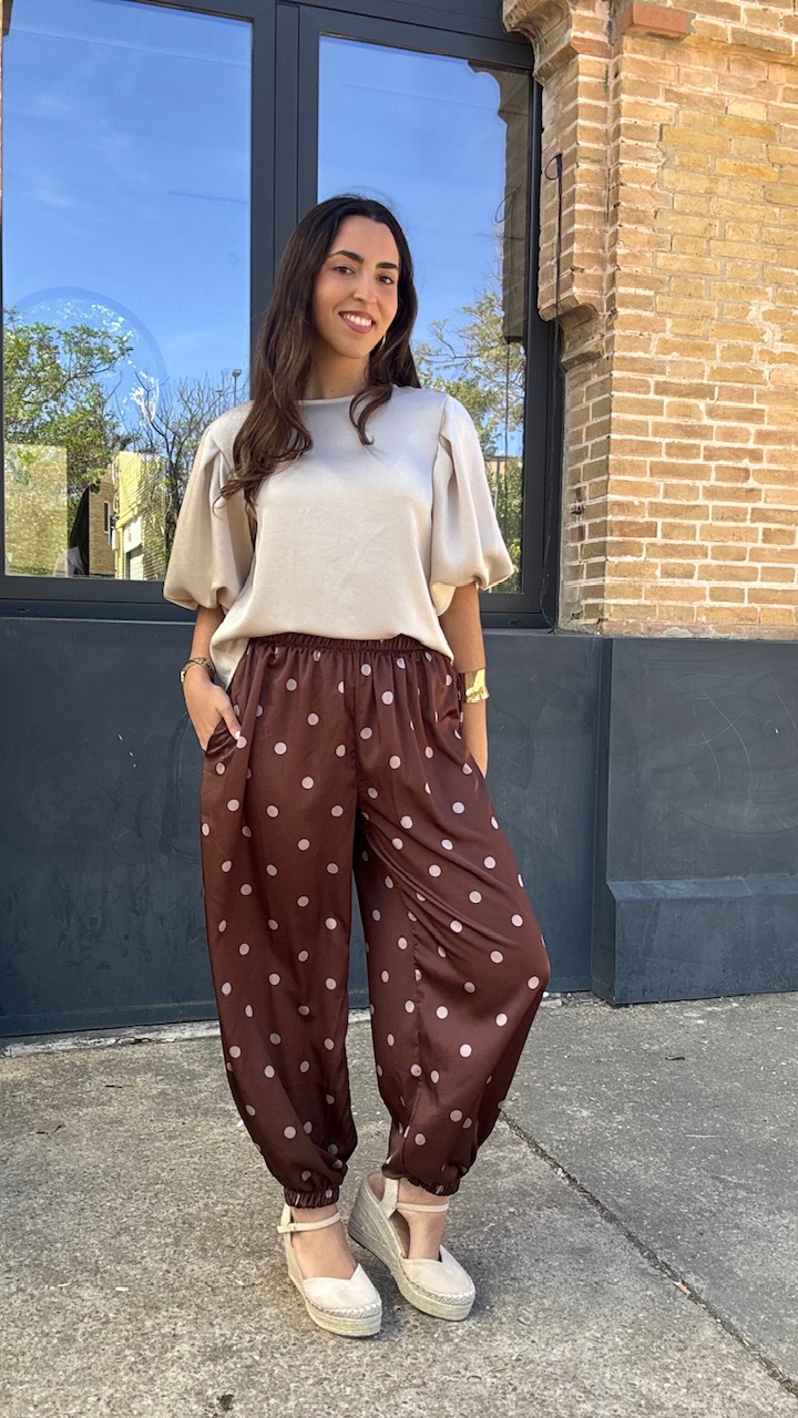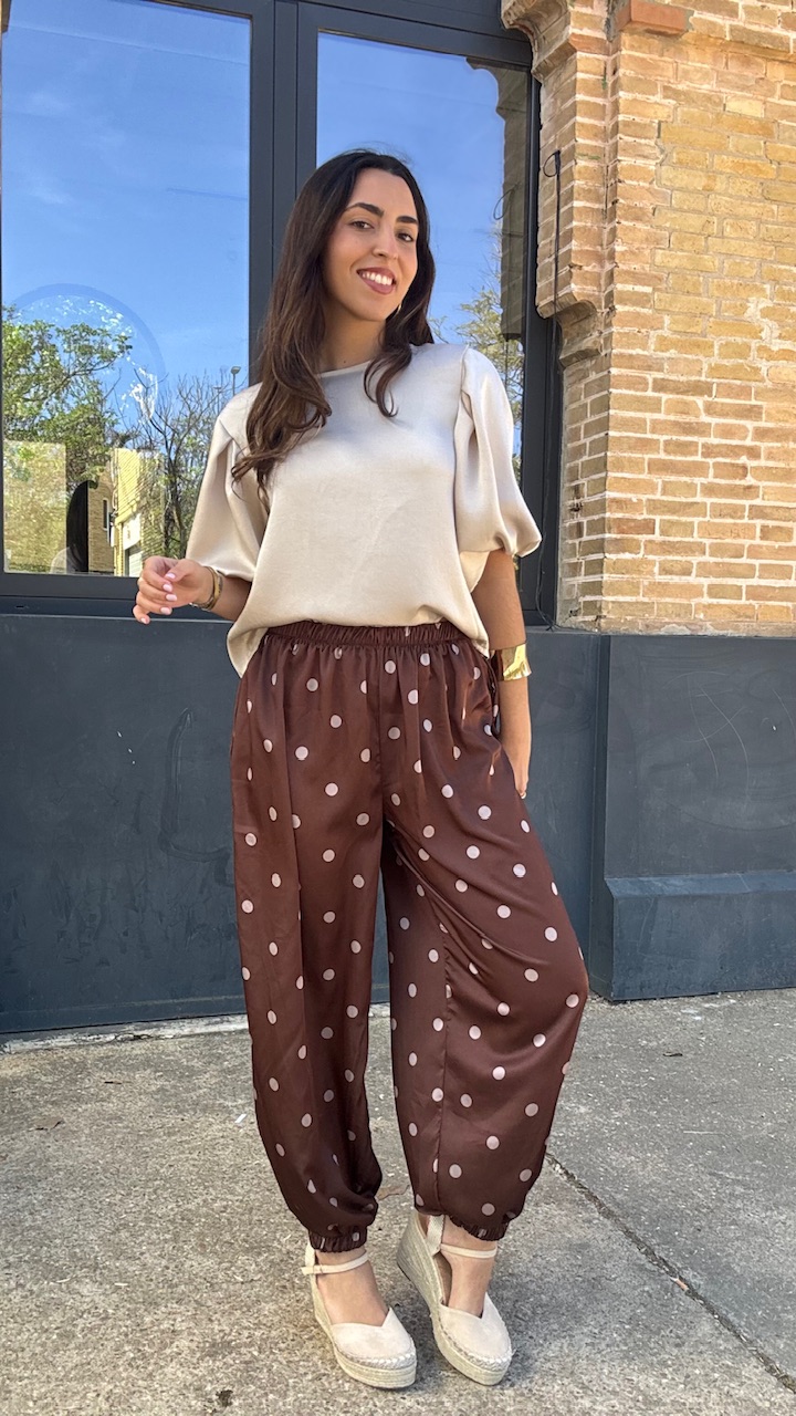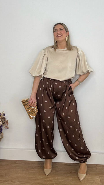 Pantalón bombacho confeccionado en tejido de satén en color marrón con lunares en champán. Lleva cinturilla elástica. Talla única válida desde la talla 36 hasta la talla 44.