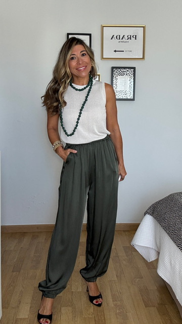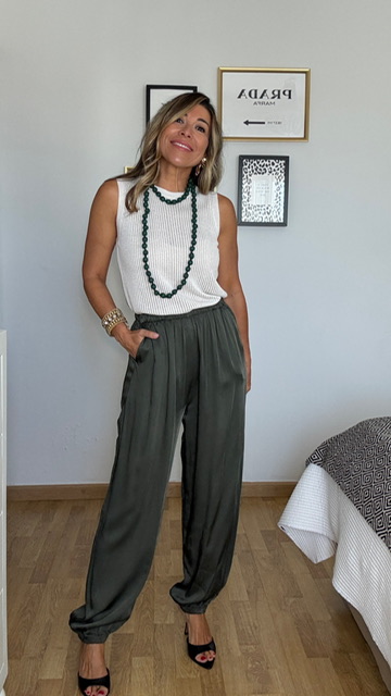 El Pantalón bombacho más buscado de esta temporada. Está confeccionado en tejido satinado fluido en color caza, cinturilla elástica y gomilla elástica en la terminación para darle ese efecto globo y con caída. Lleva bolsillos. Talla única válida desde la 34 hasta la 40.