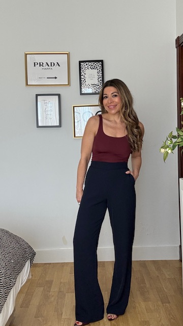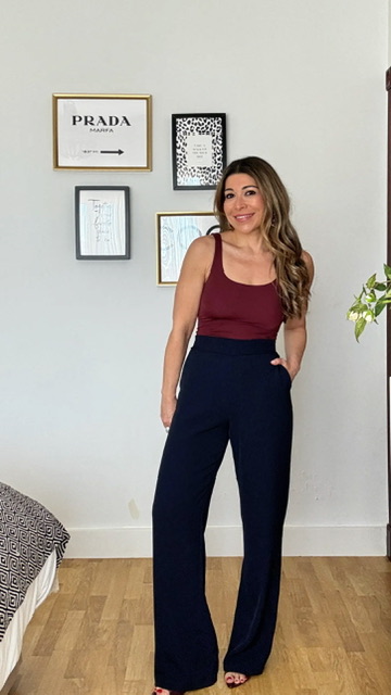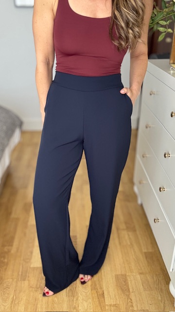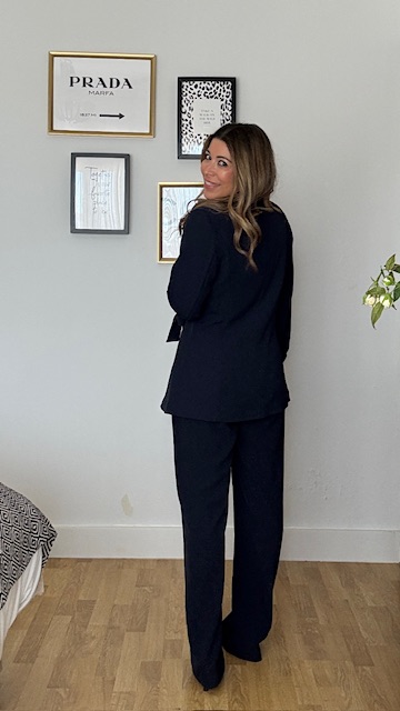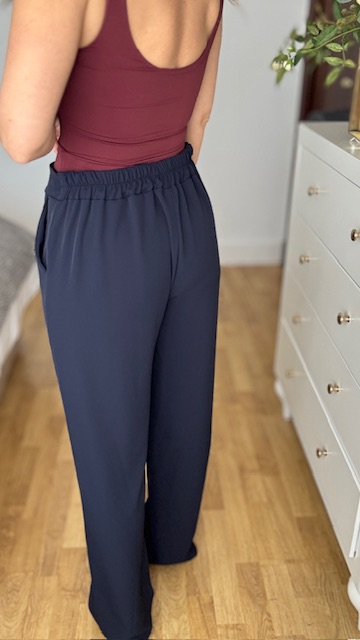Pantalón de corte recto confeccionado en tejido de crepé en color azul marino, lleva cinturilla elástica en la parte trasera. Talla única.