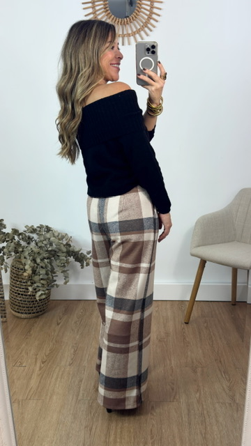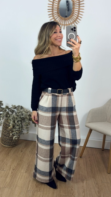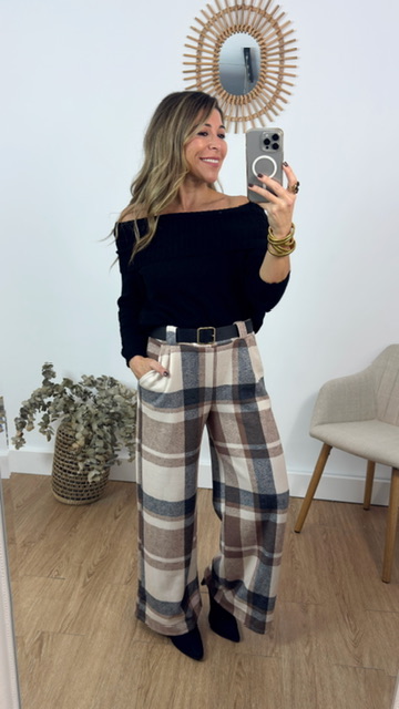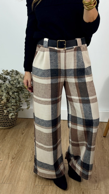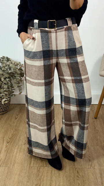 Pantalón con estampado de cuadritos en tonos beige con cinturón de lazo en color negro. Talla única válida desde la 36 hasta la 40.