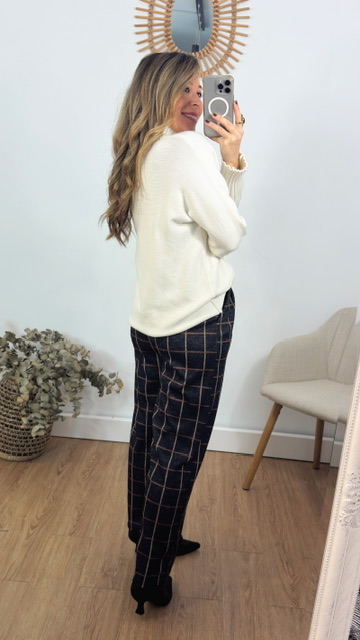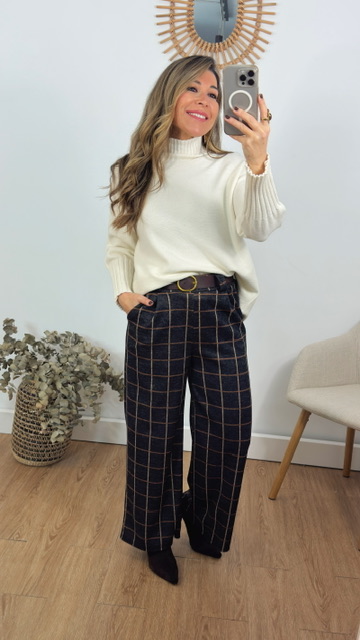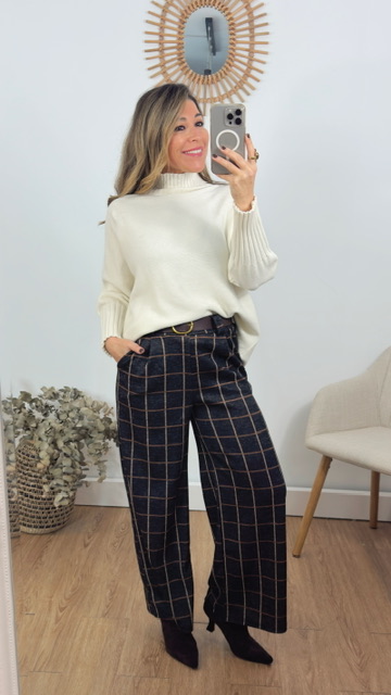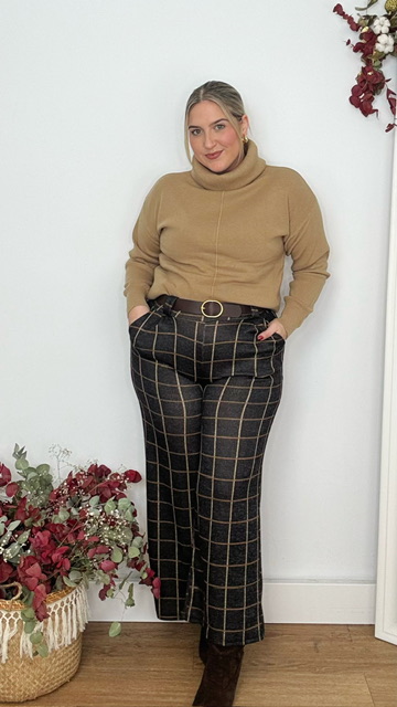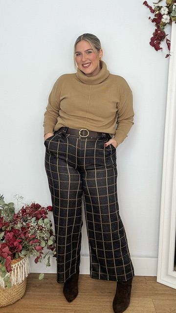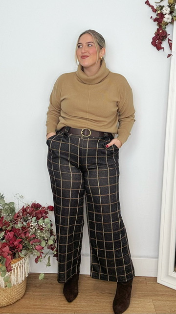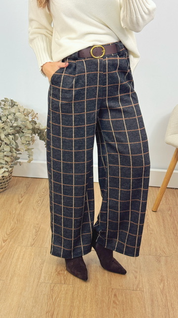 Pantalón con estampado de cuadros en color gris oscuro con cinturón . Talla única válida desde la 36 hasta la 44.