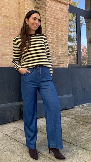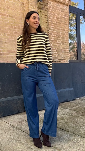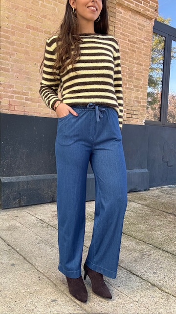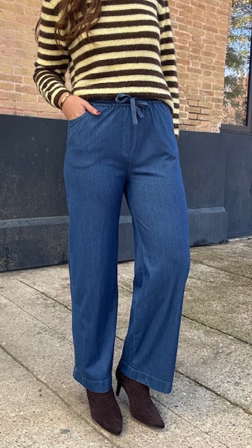 Pantalón denim elástico con cinturilla elastica. Disponible por tallas.