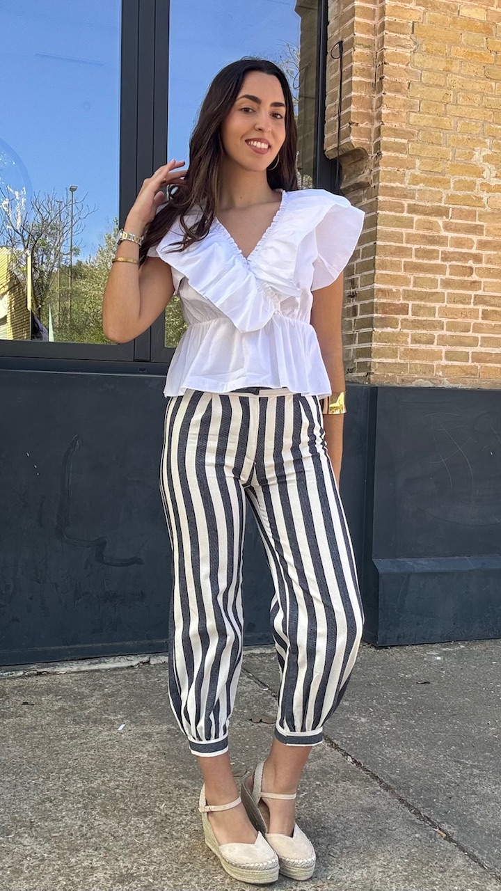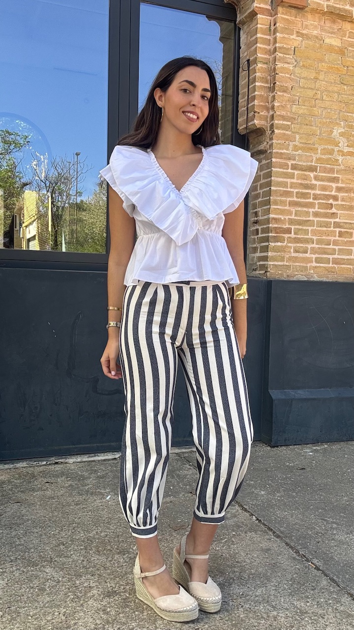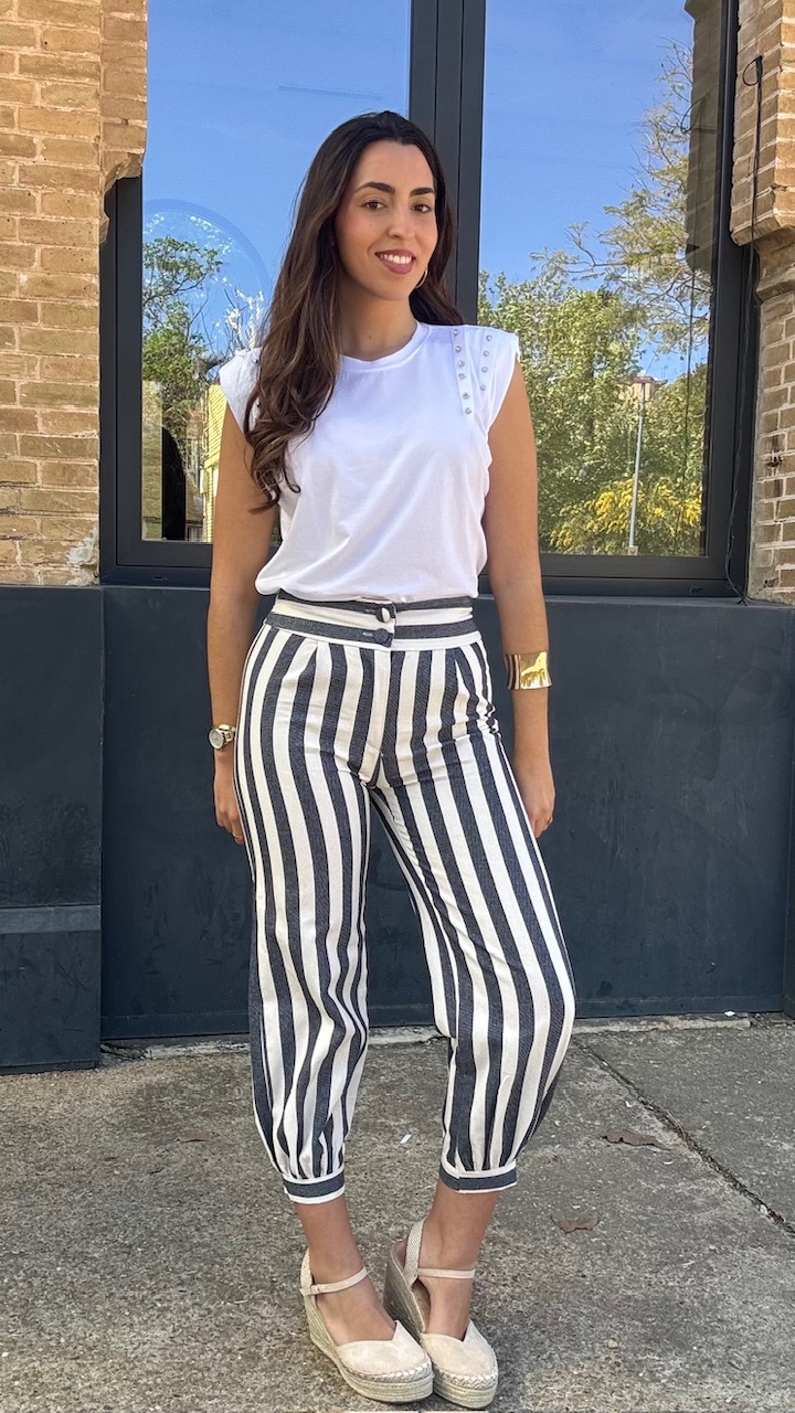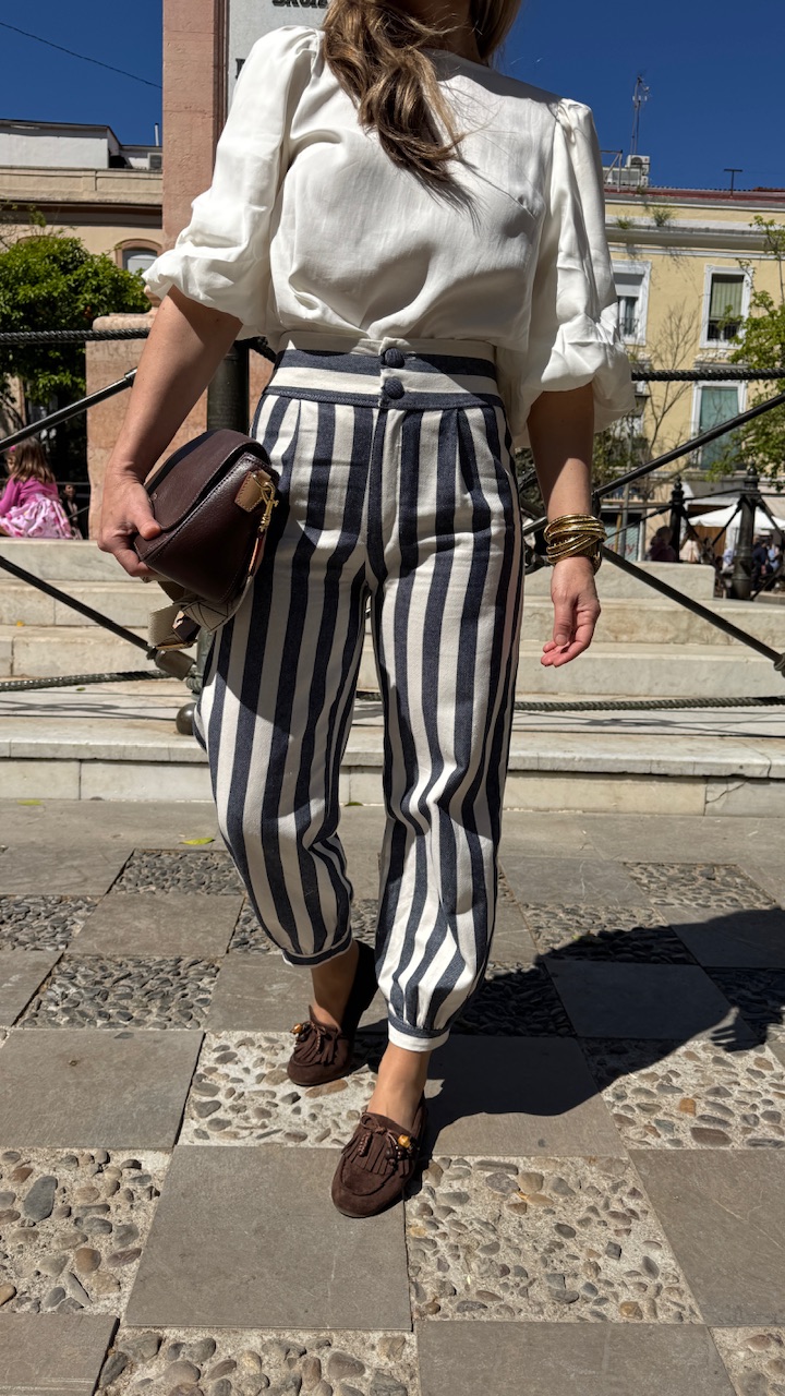 Pantalón globo con cinturilla elástica en la parte trasera con estampado de rayas en blanco y en azul . Talla única desde la talla 36 hasta la 40.