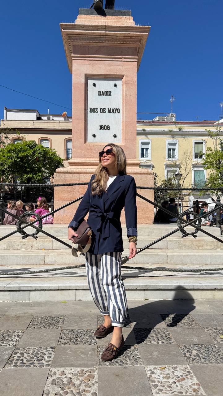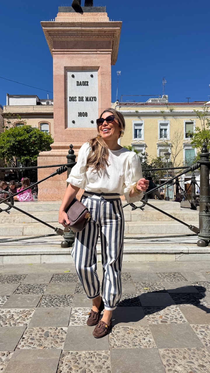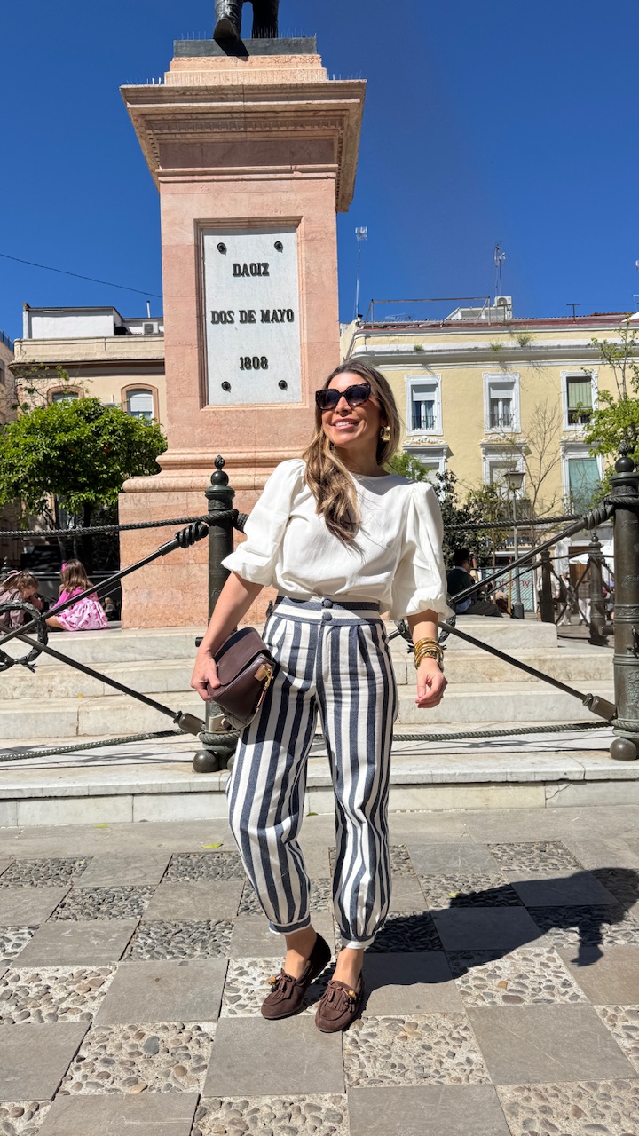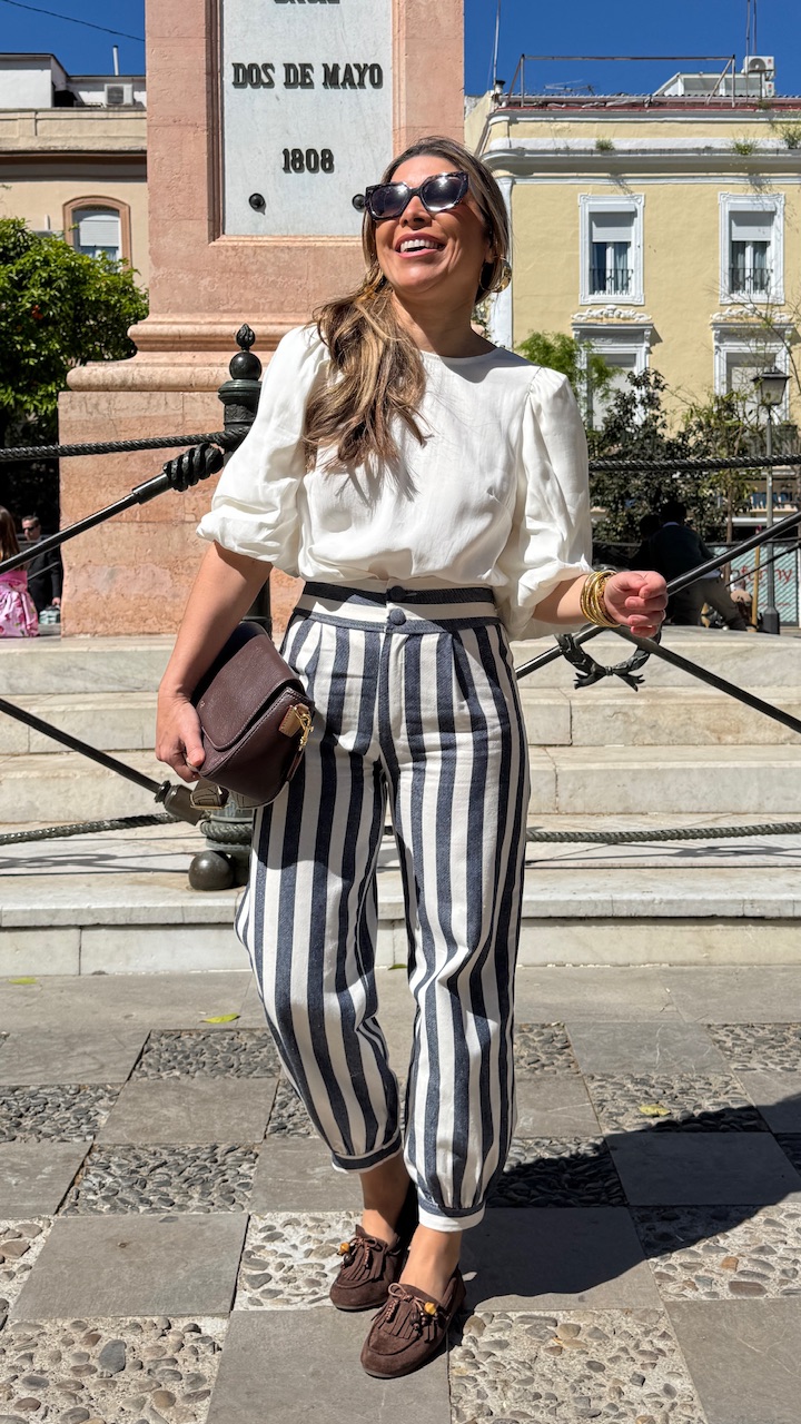Pantalón globo con cinturilla elástica en la parte trasera con estampado de rayas en blanco y en azul . Talla única desde la talla 36 hasta la 40.