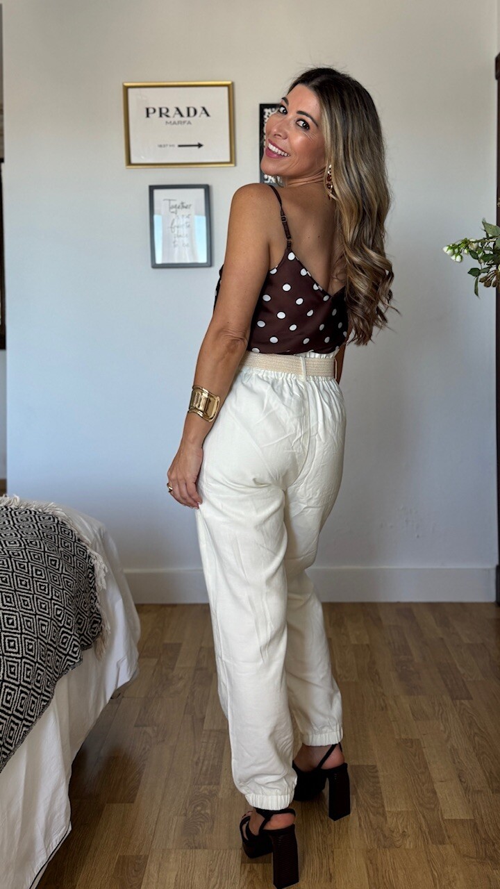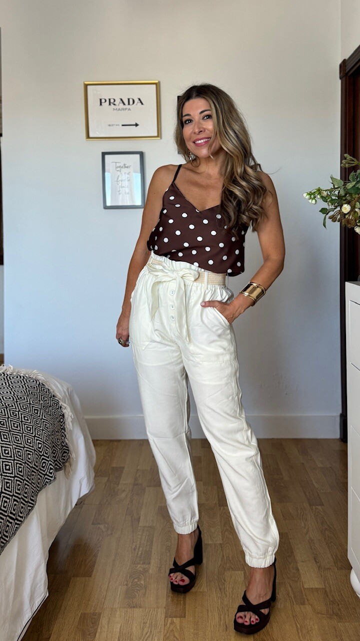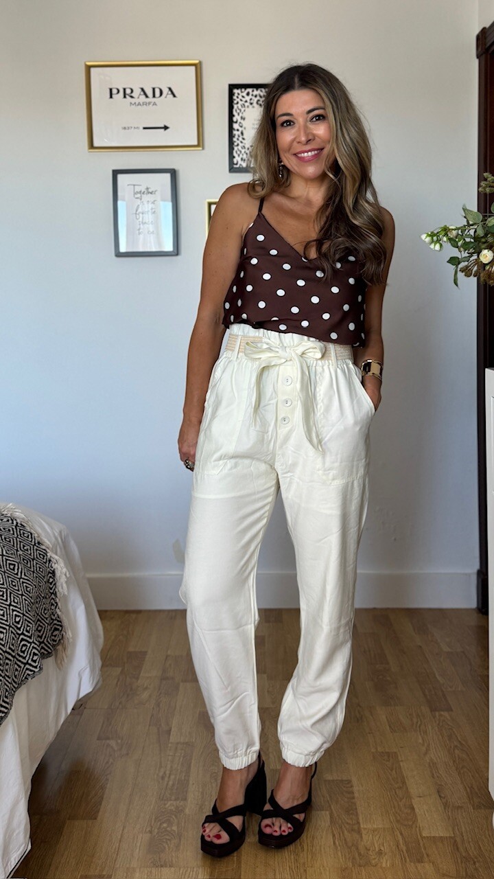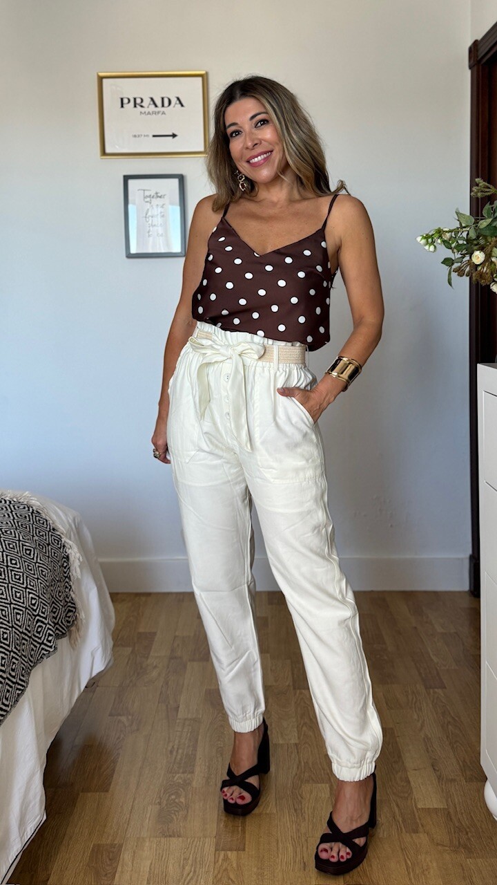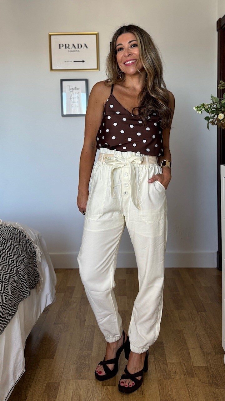 Pantalón globo con botones en color beige con cinturilla elástica y cinturón de rafia con acabado en lazo . Talla única válida desde la talla 36 hasta la talla 40/42.