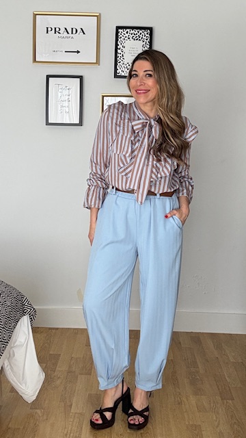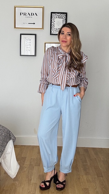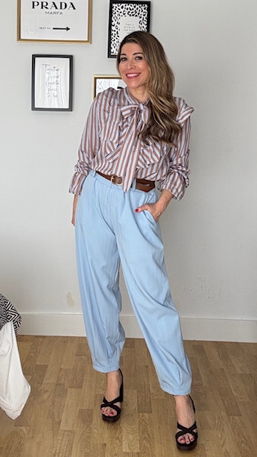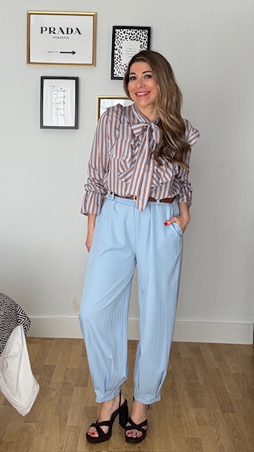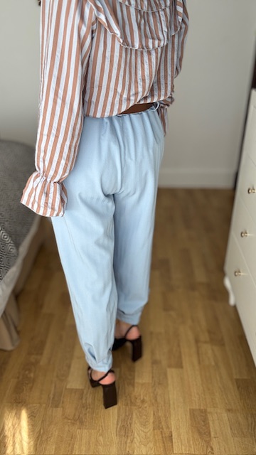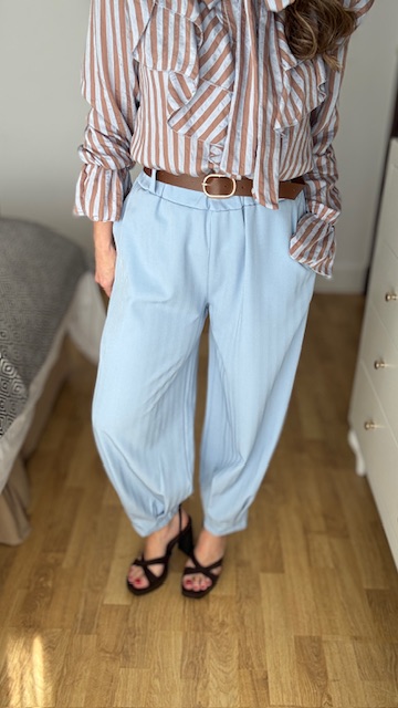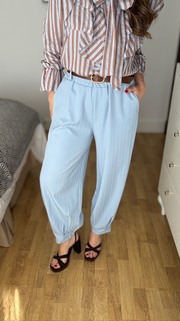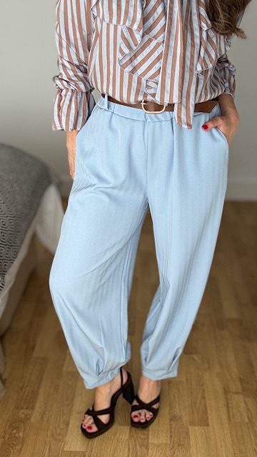 Pantalón tipo ballon en color celeste con cinturilla elástica y cinturón en color marrón. Talla única válida desde la 36 hasta la 42/44.