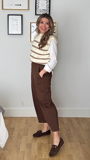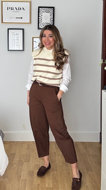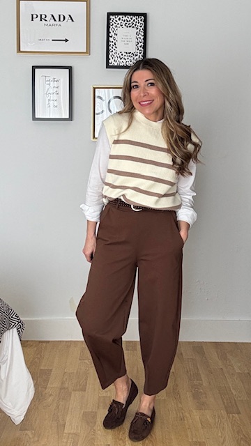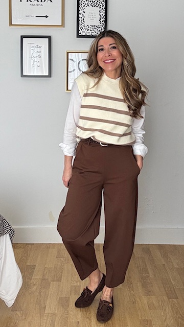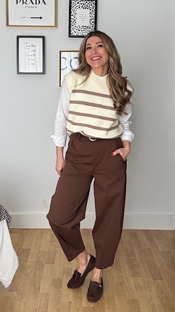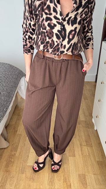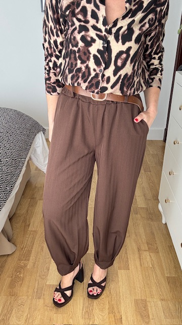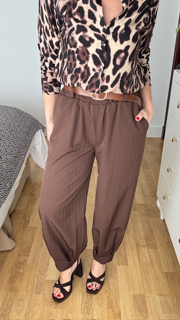 Pantalón tipo ballon en color marrón con cinturilla elástica y cinturón en color marrón. Talla única válida desde la 36 hasta la 42/44.