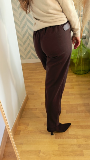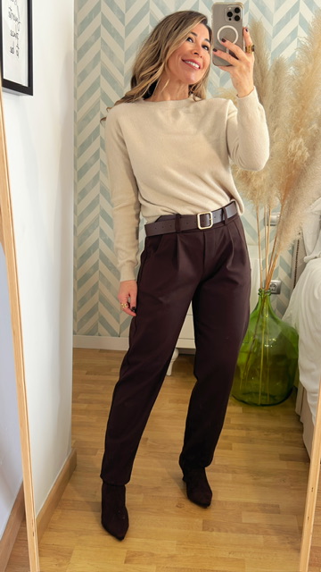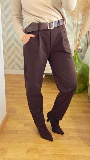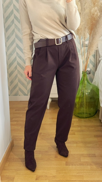 Pantalón de paño con pinzas y cinturón en color marrón. Talla única válida desde la 36 hasta la 42.
