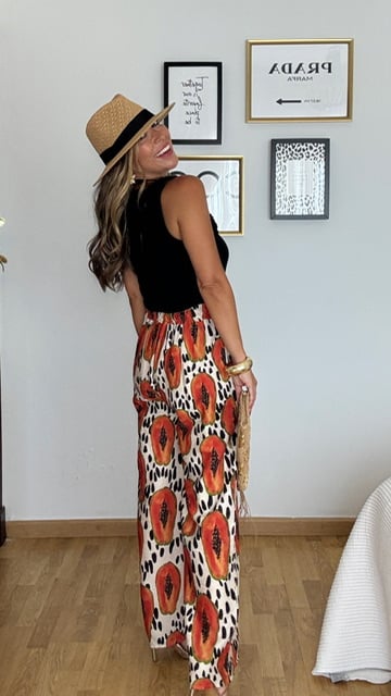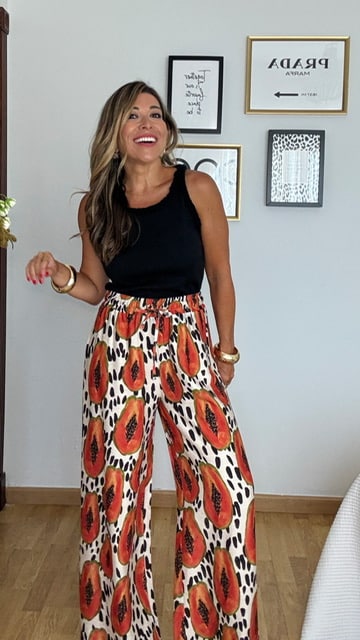 Pantalón confeccionado en tejido 100% viscosa con estampado de papaya con cinturilla elástica. Talla única válida desde la 36 hasta la 40/42.