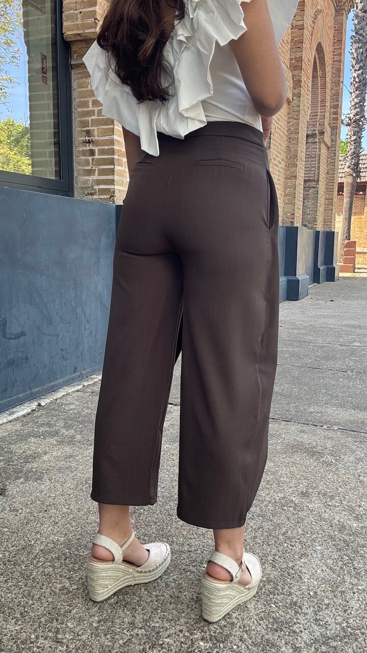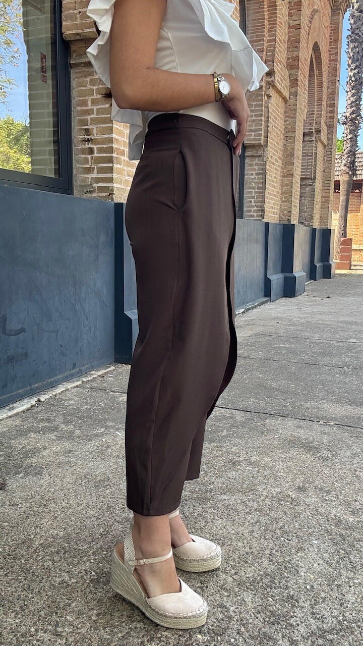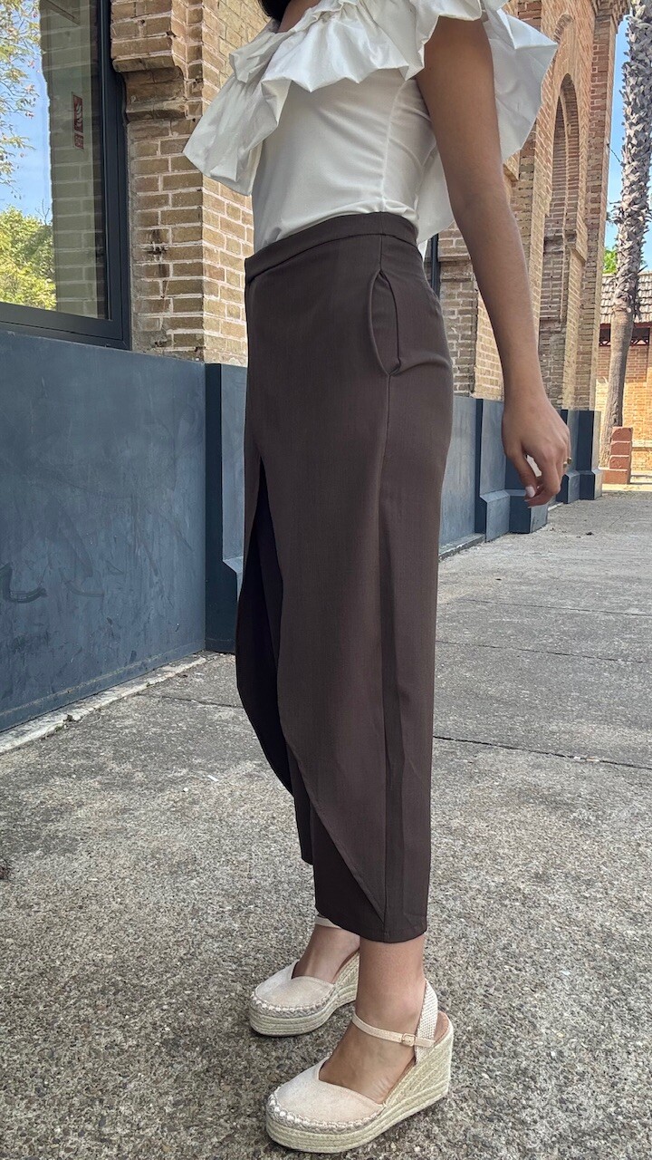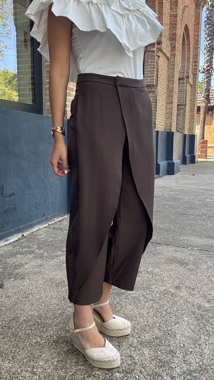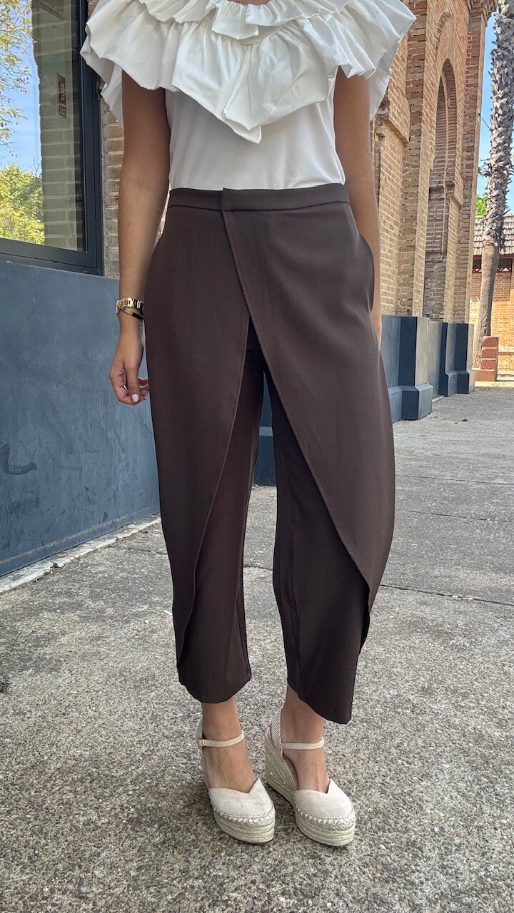 Pantalón pareo de tiro medio con cierre frontal con cremallera, botón y ganchos metálicos en color marrón. Disponible por tallas.