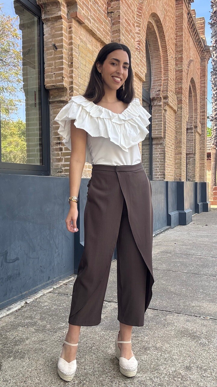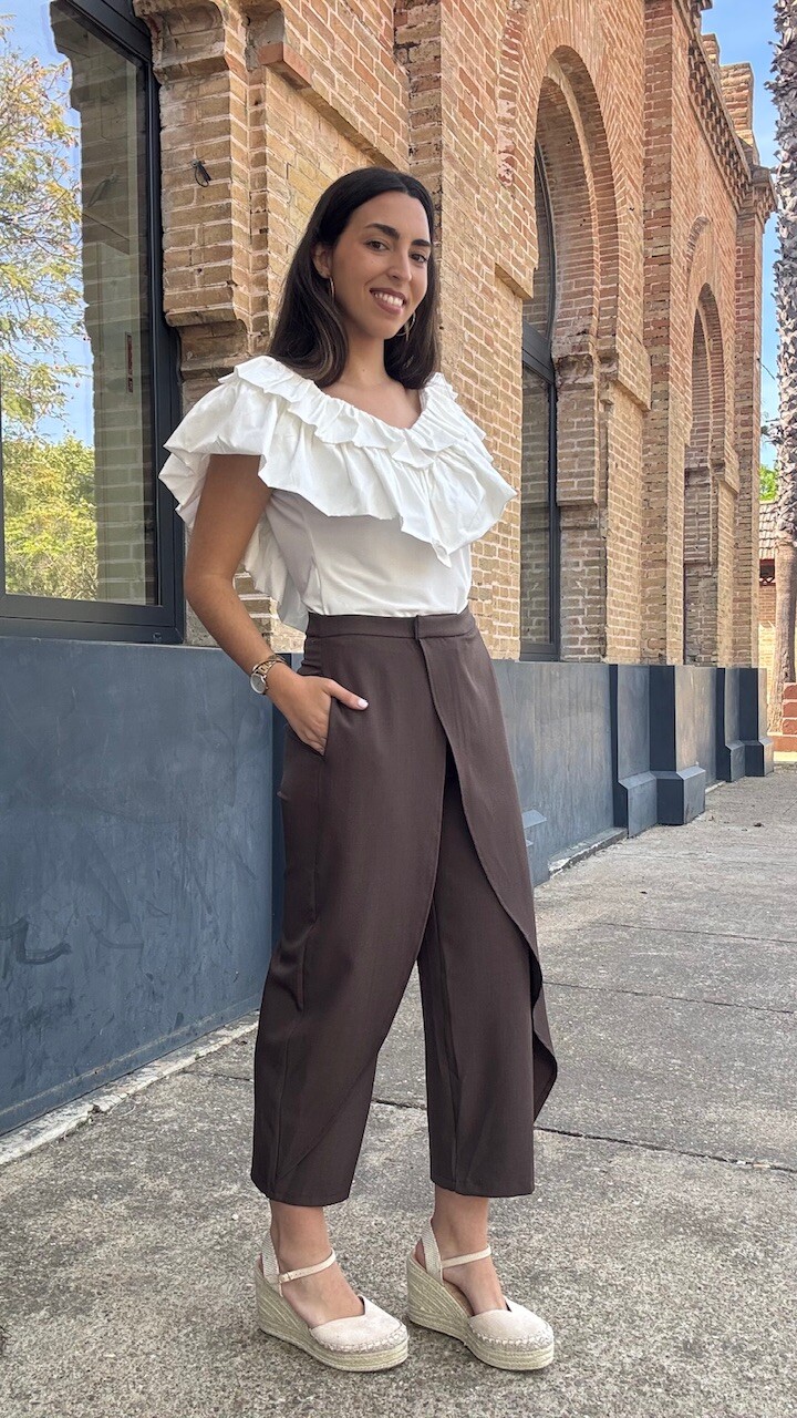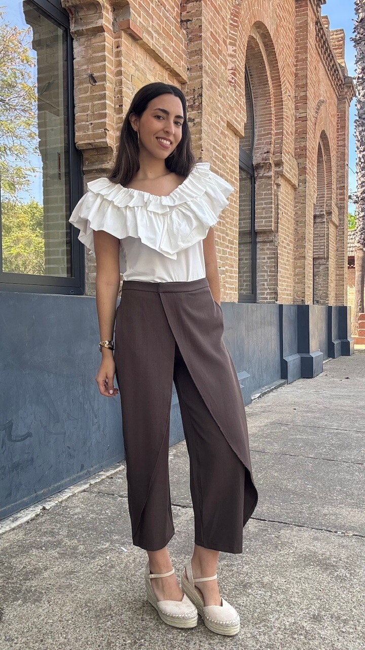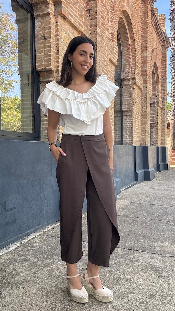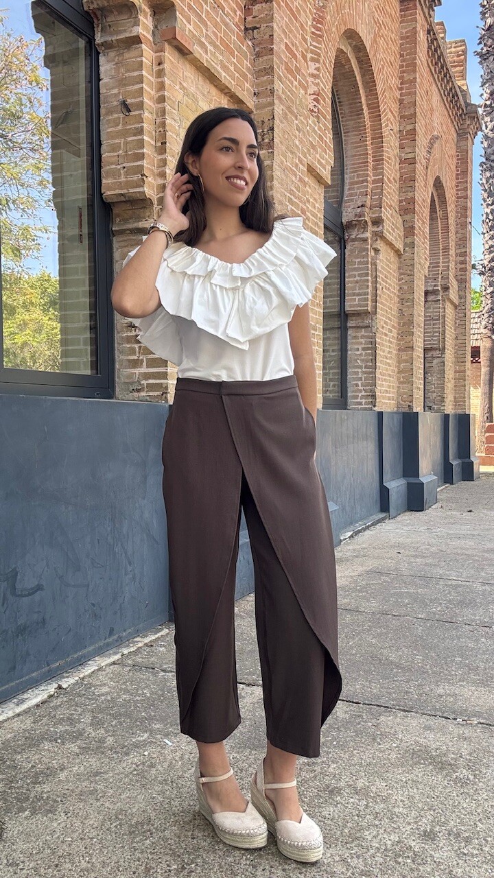 Pantalón pareo de tiro medio con cierre frontal con cremallera, botón y ganchos metálicos en color marrón. Disponible por tallas.