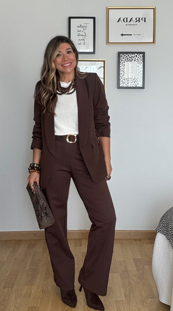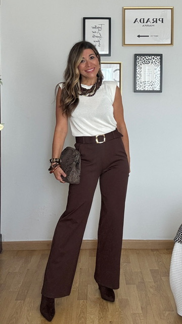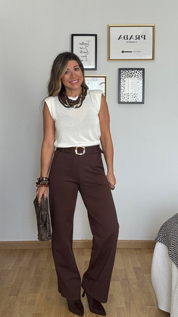 Pantalón confeccionado en tejido de punto roma en color marrón chocolate , lleva incluido cinturón del mismo tejido con hebilla dorada. Disponible por tallas.
