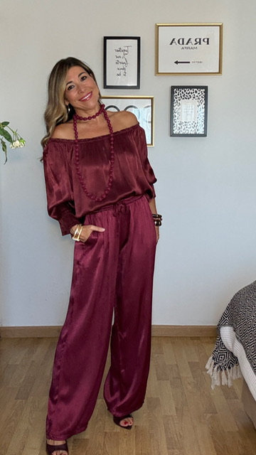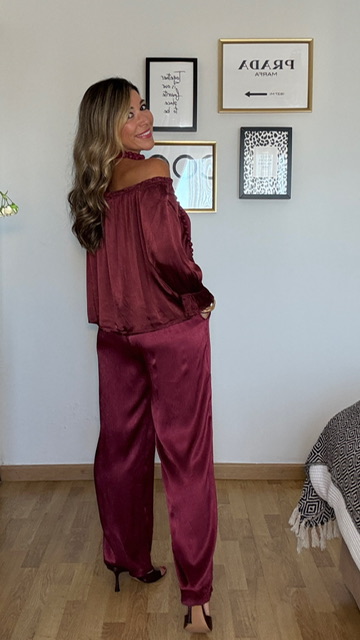Pantalón satinado con una leve tramita en el tejido que le da un toque diferente, disponible en color burdeos y con cinturilla elástica. Talla única válida desde la 36 hasta la 40.Talla única válida desde la 36 hasta la 44. El pantalón satén frida es diferente tono al pantalón Frida (tener en cuenta).