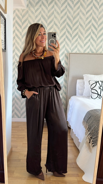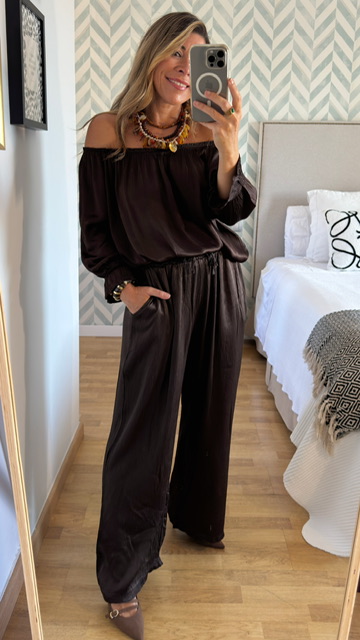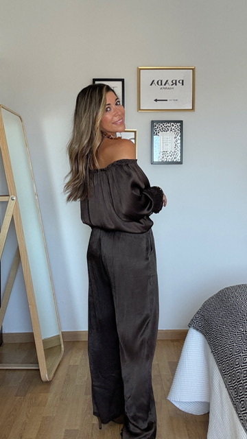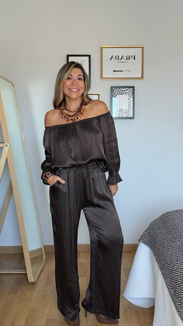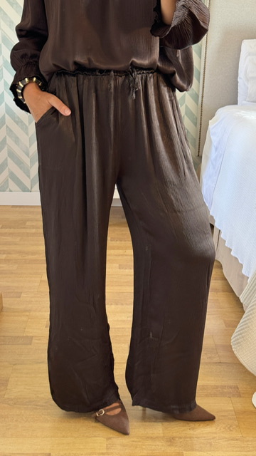 Pantalón satinado con una leve tramita en el tejido que le da un toque diferente, disponible en color marrón y con cinturilla elástica. Talla única válida desde la 36 hasta la 40.Talla única válida desde la 36 hasta la 44. El pantalón satén Frida es diferente tono al pantalón Frida (tener en cuenta).