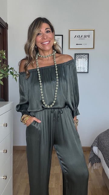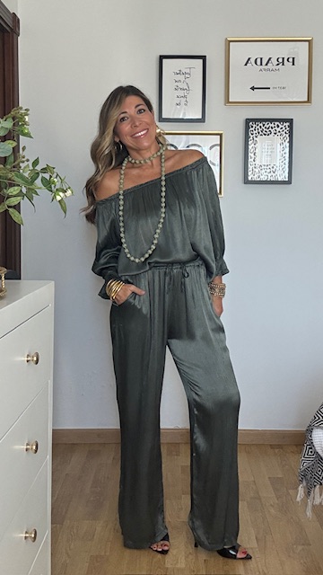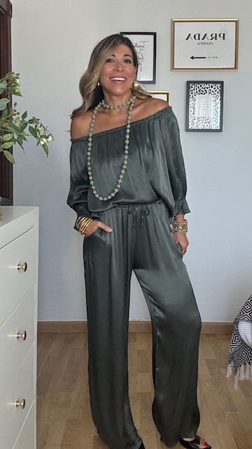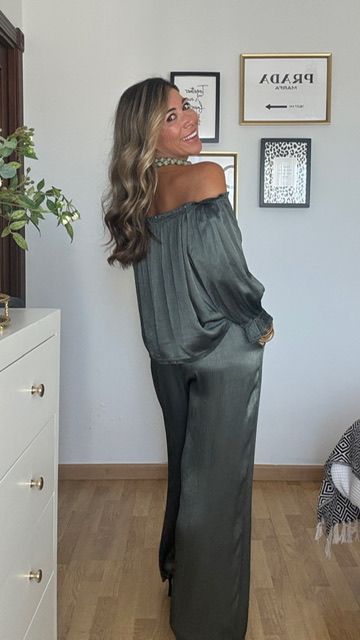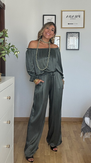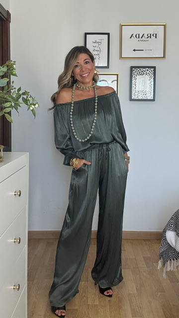 Pantalón satinado con una leve tramita en el tejido que le da un toque diferente, disponible en color caza y con cinturilla elástica. Talla única válida desde la 36 hasta la 40. lo puedes combinar con la blusa Frida y collar de cuentas forradas en seda del mismo tono.