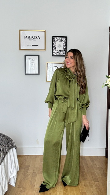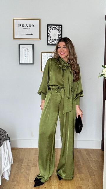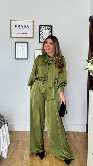 Pantalón satinado de pata ancha con cinturón de tela satinada en color verde oliva. Talla única válida desde la 38 hasta la 40/42.