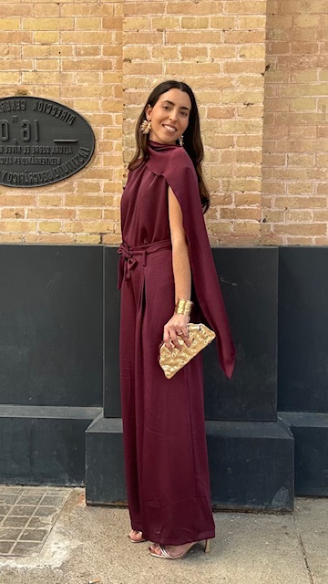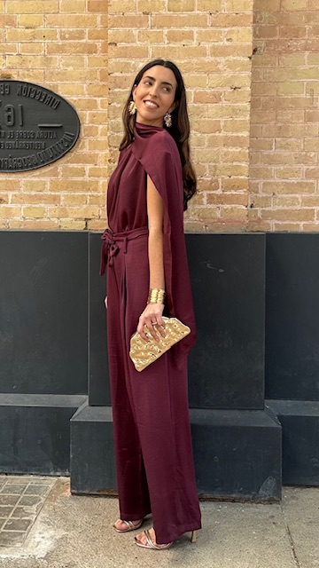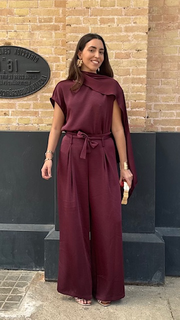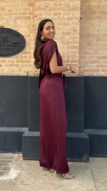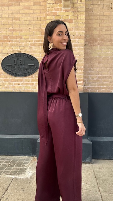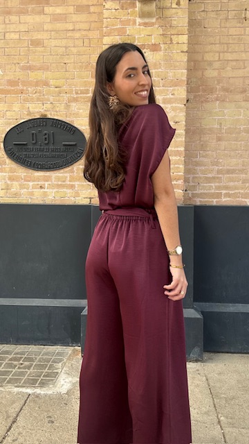 Pantalón satinado de pata ancha con cinturón de tela satinada en color burdeos. Talla única válida desde la 38 hasta la 40/42.