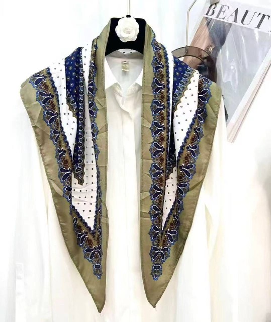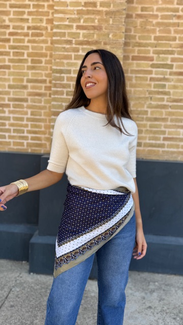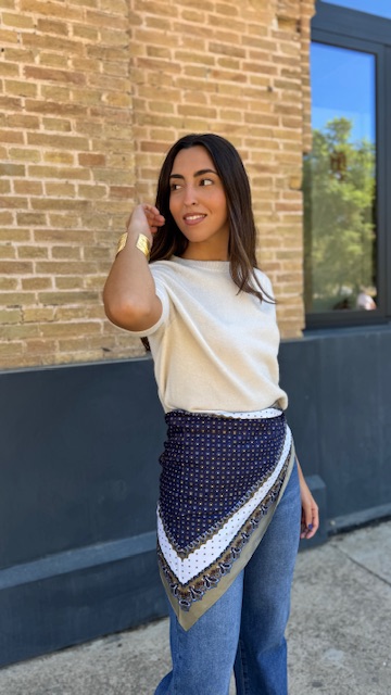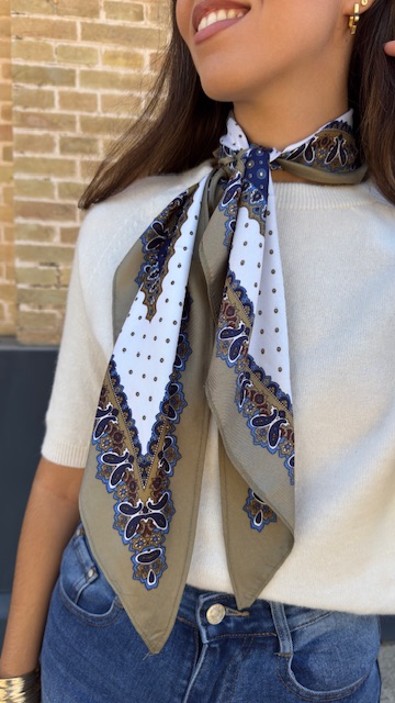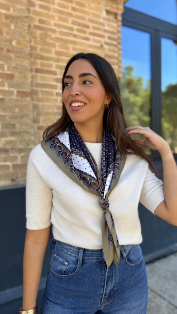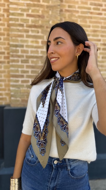 Pañuelo estampado confeccionado en tejido con tacto sedoso con forma triangular, que puede usar tanto para el cuello como de bandana en la cintura. Tamaño 130x64x64