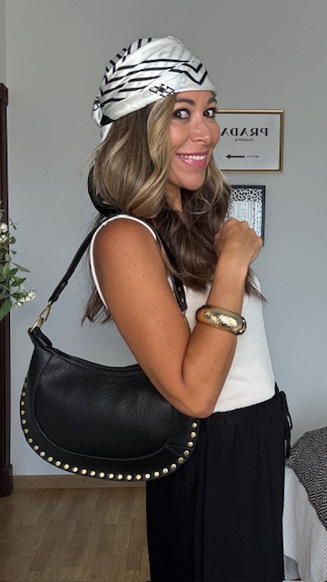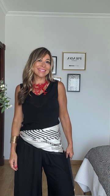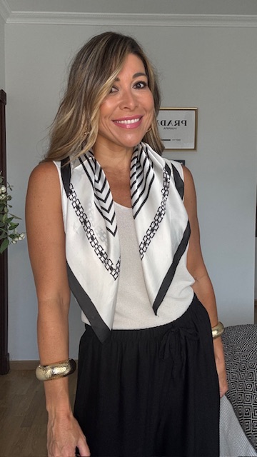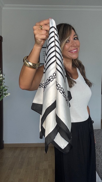 Pañuelo cuadrado de tacto sedoso estampado en colores blanco y negro.