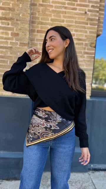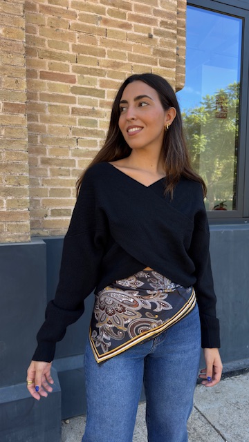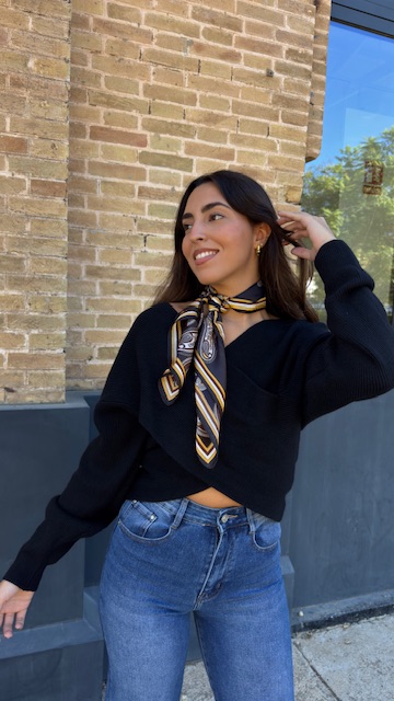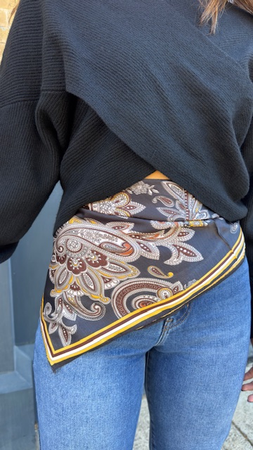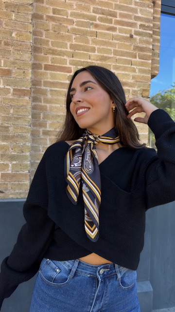 Pañuelo estampado confeccionado en tejido con tacto sedoso con forma cuadrada, que puede usar tanto para el cuello como de bandana en la cintura. Tamaño 70 x 70