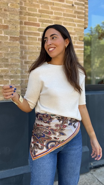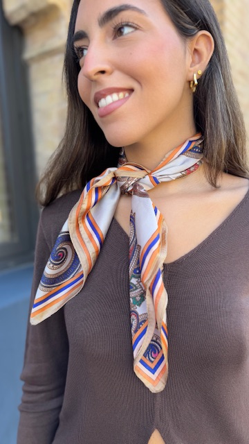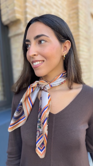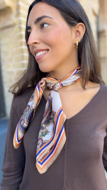 Pañuelo estampado confeccionado en tejido con tacto sedoso con forma cuadrada, que puede usar tanto para el cuello como de bandana en la cintura. Tamaño 70 x 70