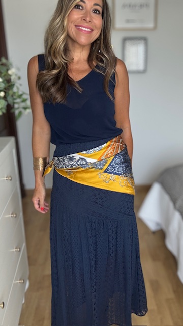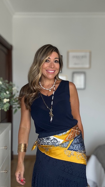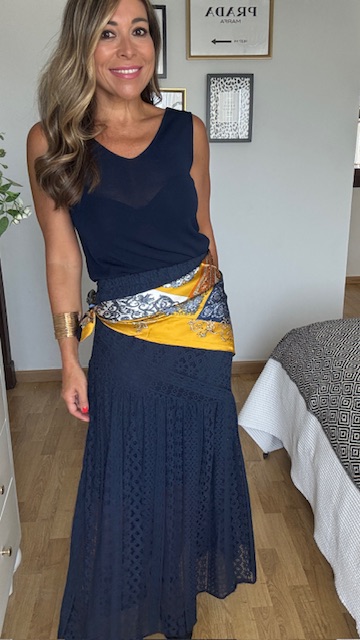 Pañuelo cuadrado de tacto sedoso estampado en colores ocres, verdes y azules.