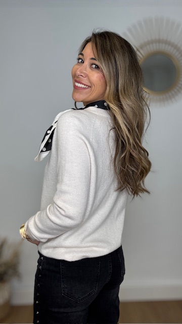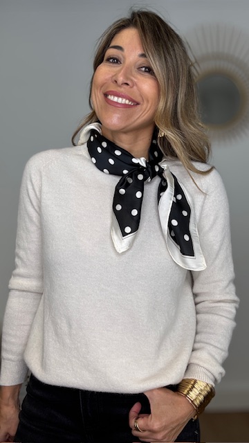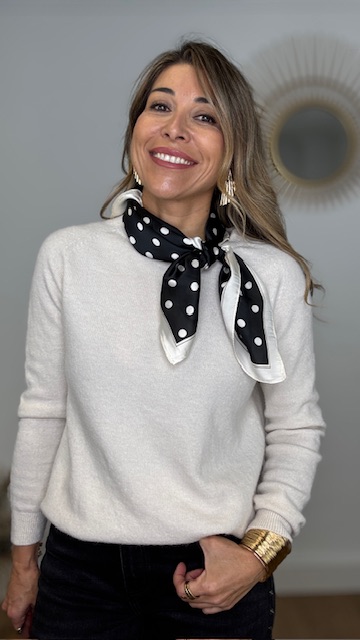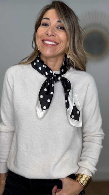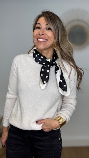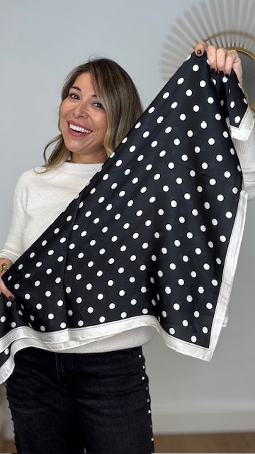 Pañuelo cuadrado en color negro con estampado de lunares en blanco.