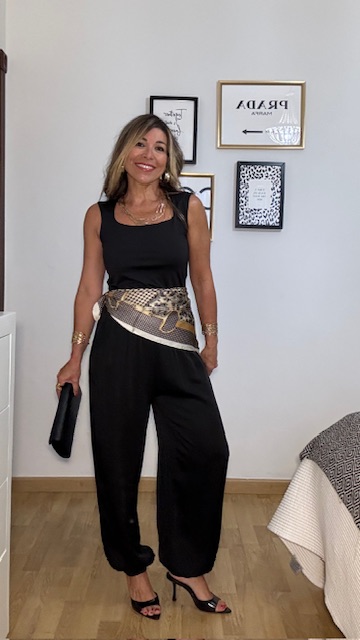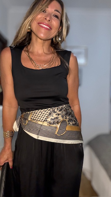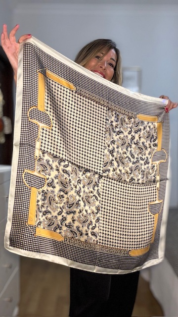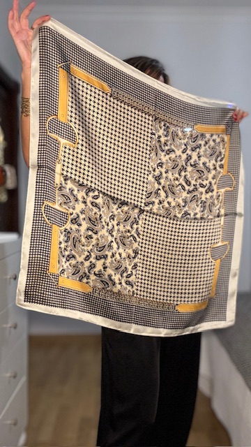 Pañuelo confeccionado en tejido de 100% poliéster con estampado de pata de gallo.