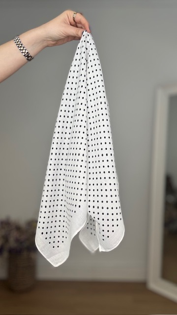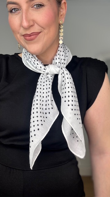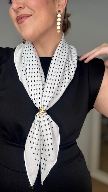 Pañuelo en color blanco con estampado de lunares pequeños en color negro.100% poliester. Medida:66×69.
