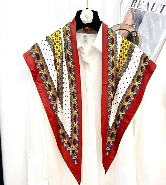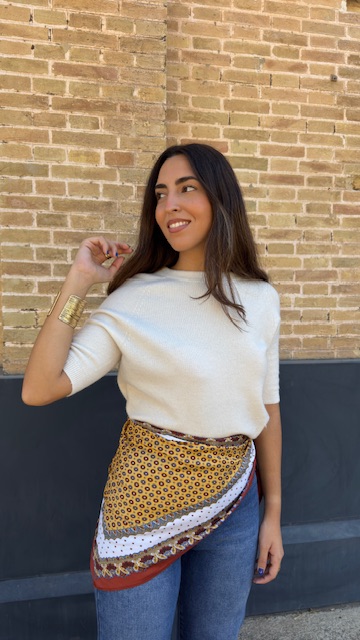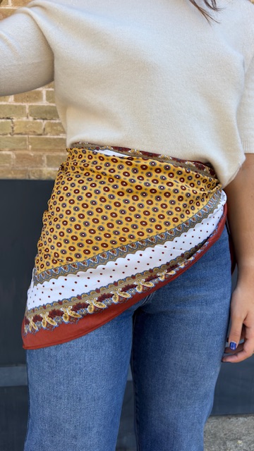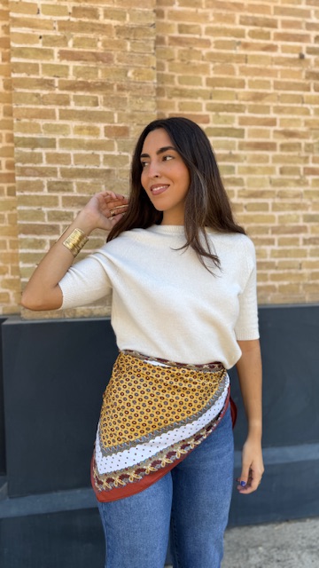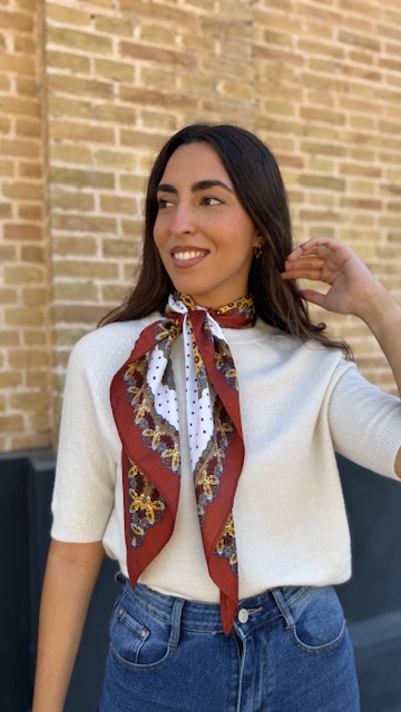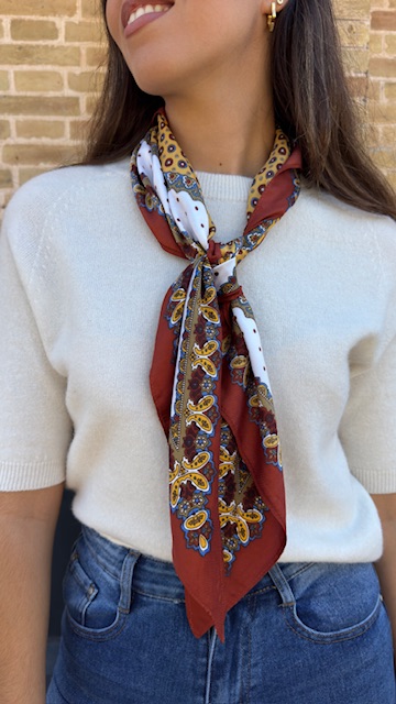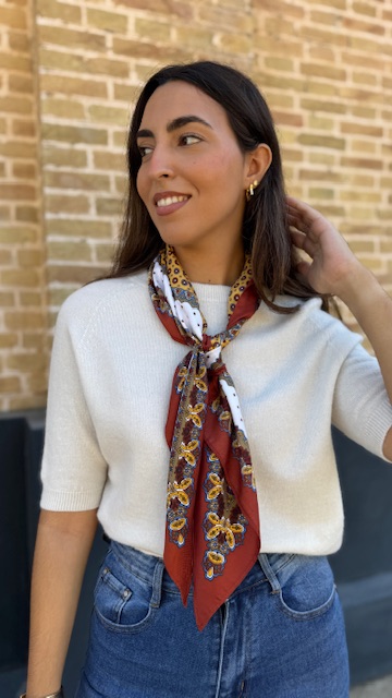 Pañuelo estampado confeccionado en tejido con tacto sedoso con forma triangular, que puede usar tanto para el cuello como de bandana en la cintura. Tamaño 130x64x64