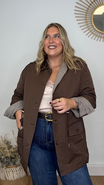 Parka en color marrón chocolate con forro de cuadros con bolsillos en parte delantera. Disponible por tallas.