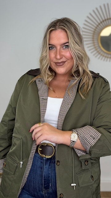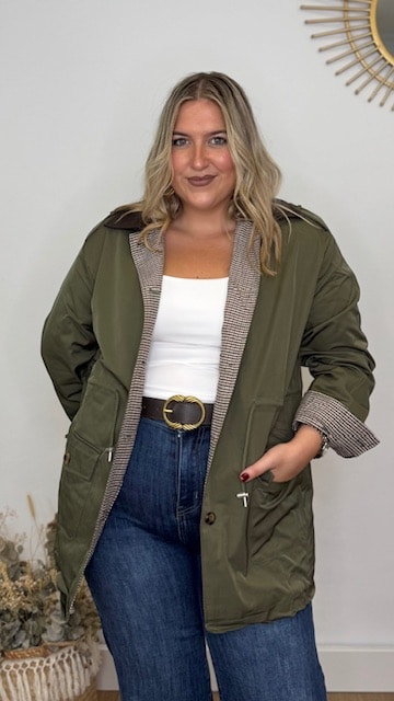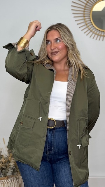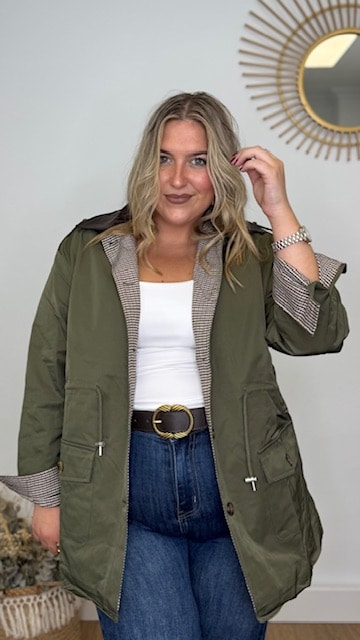 Parka en color caza con forro de cuadros con bolsillos en parte delantera. Disponible por tallas.
