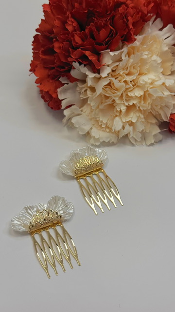 Peinecillos con forma de pétalos nacarados en color dorado . 40%METAL + 60 % PLASTICO. Se venden por unidades.