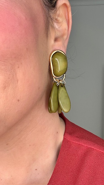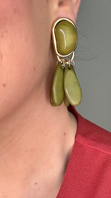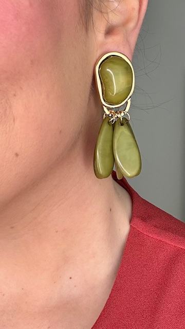Pendientes geométricos en dorados con base ovalada con piedra en color verde oliva y le cuelgan en forma de lágrima del mismo tono.80%RESINA 20%ZINC.