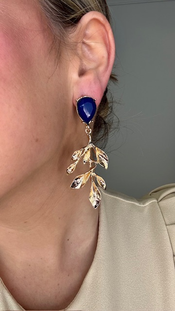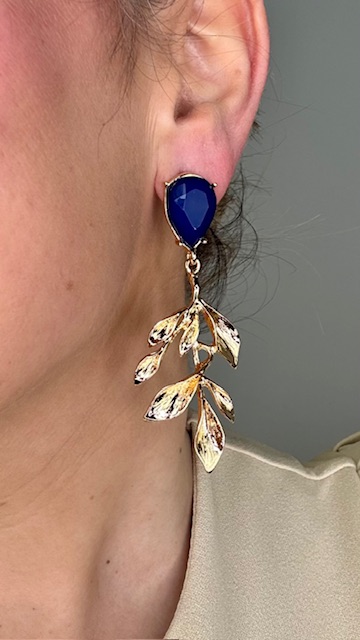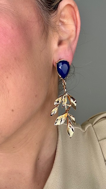 Pendientes en dorados en forma de hoja con perla parte inferior en azul. Chapado en Oro.