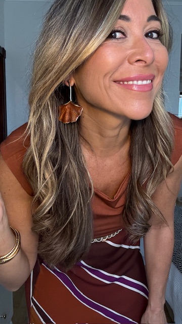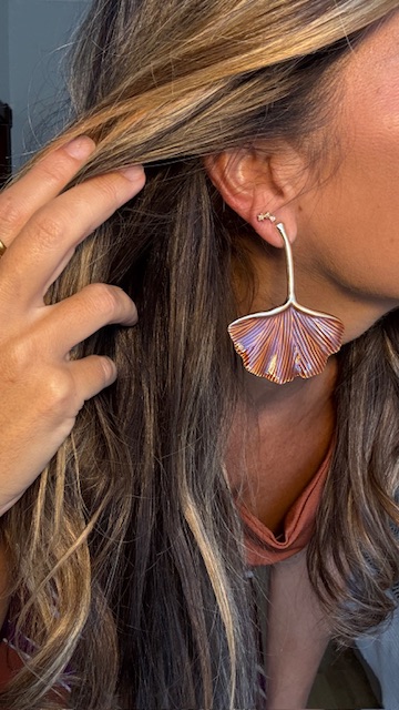 Pendientes dorados con colgante de hoja lacada en color teja. Cierre con tornillo.