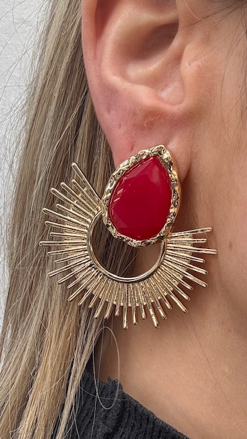Pendientes dorados que cuentan con una piedra en color rojo intenso. De la base de la lágrima cuelga un semicírculo dorado del que emergen múltiples rayos metálicos de diferentes longitudes.