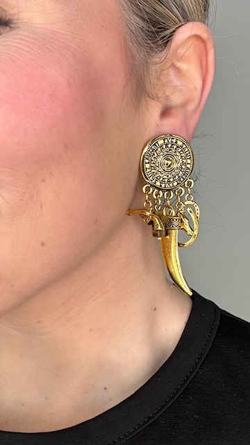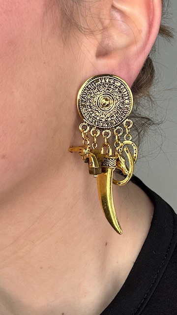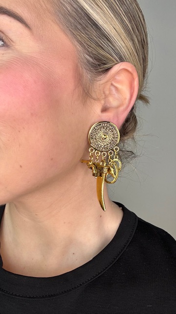 Pendientes en dorado envejecido con forma circular donde le cuelgan varios charms diferentes .ALEACIÓN+PIEDRA.