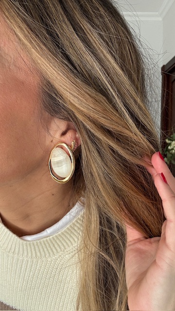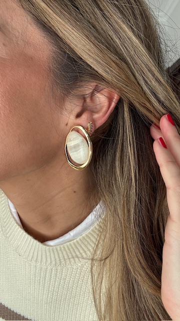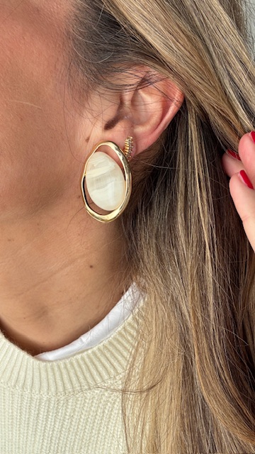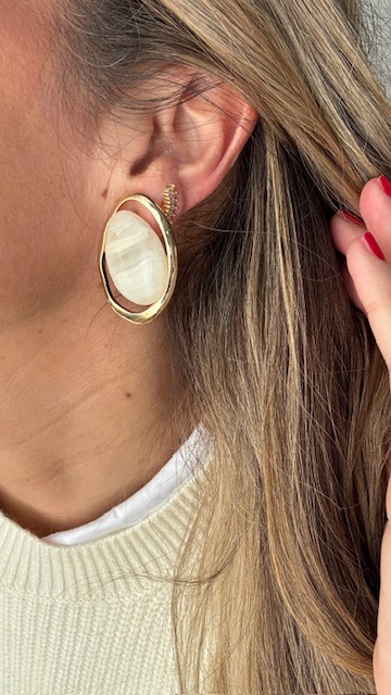 Pendientes en dorados con forma ovalada con perla central en color beige. 50% alloy + 50% resin.