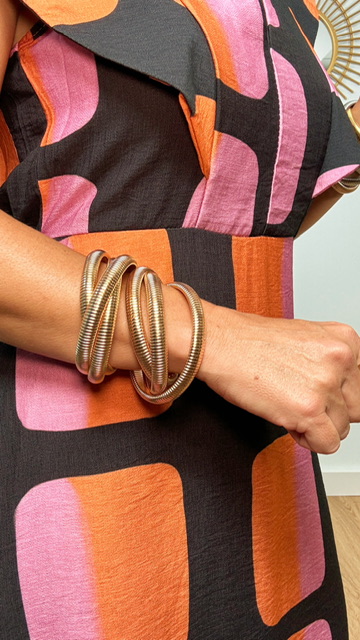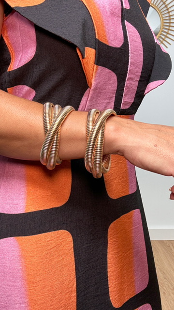 Conjunto de tres pulseras entrelazadas fabricadas metal no acero combinadas en color dorado. Son un poco elásticas. Diámetro de 6,5 cm