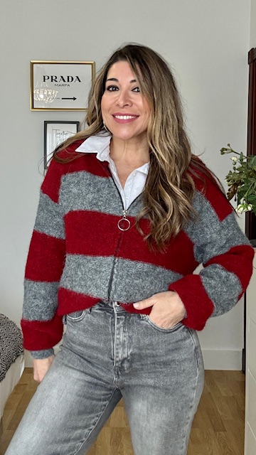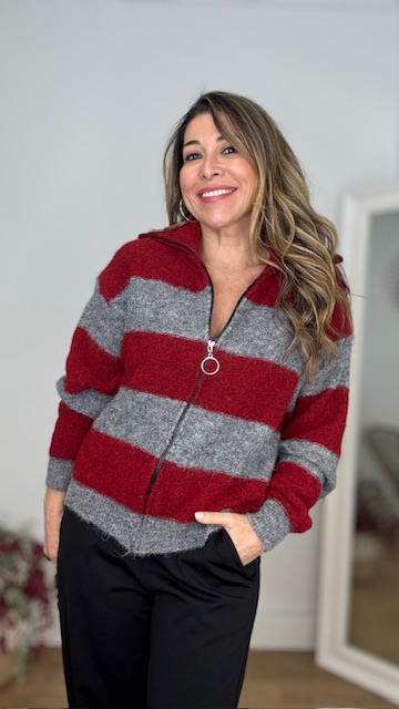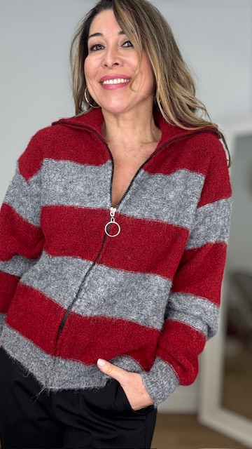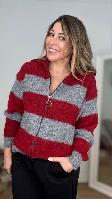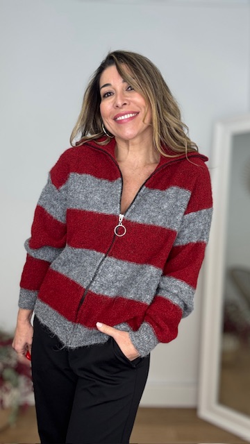 Rebeca con cremallera en la parte delantera con estampado de rayas en color burdeos y gris. Talla única válida desde la 36 hasta la 44.