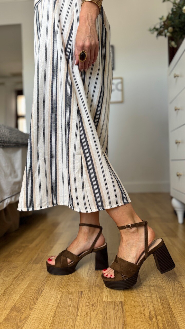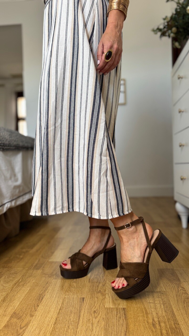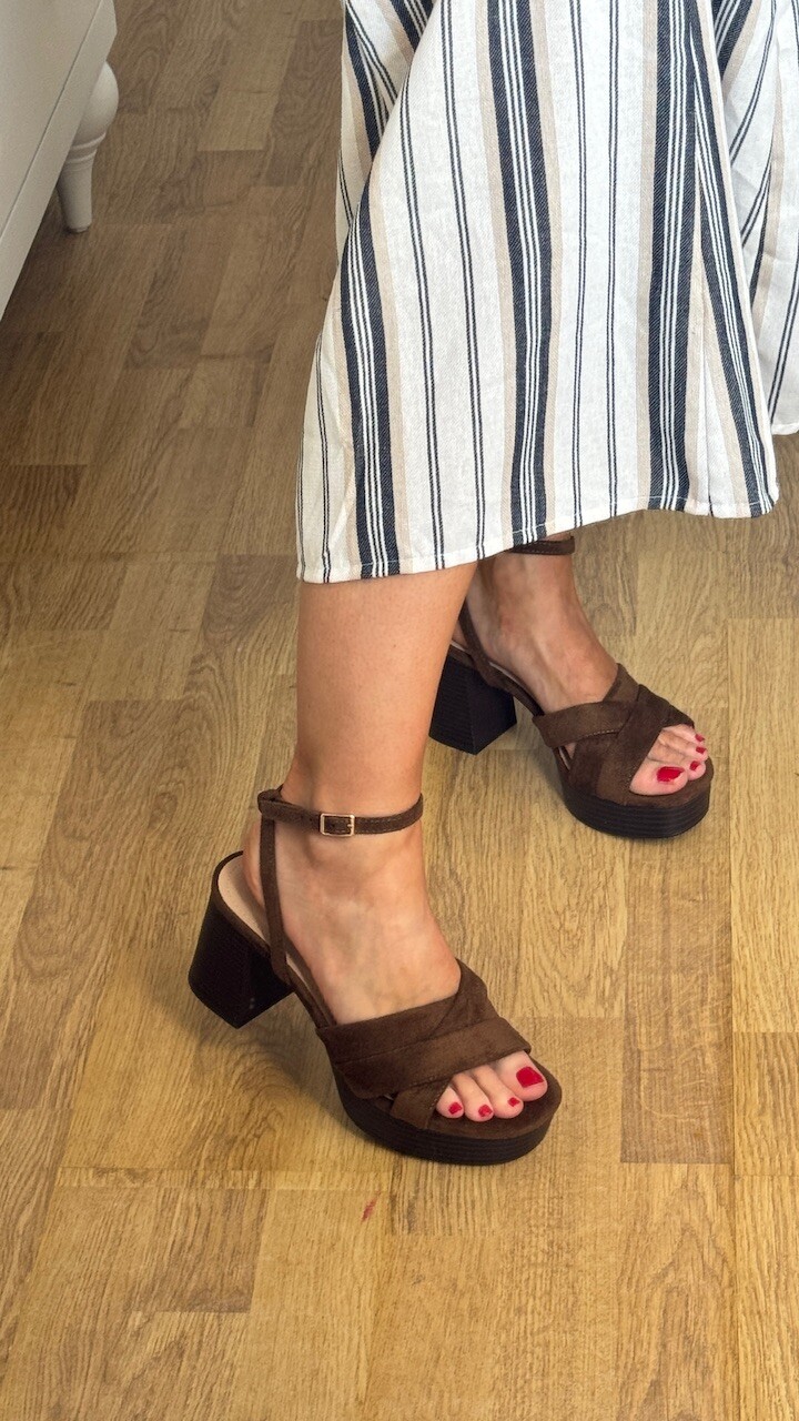 Sandalia con tacón ancho en color marrón con plantilla acolchada. Tallan normal. tacón 8 cm Plataforma 2,5 cm.